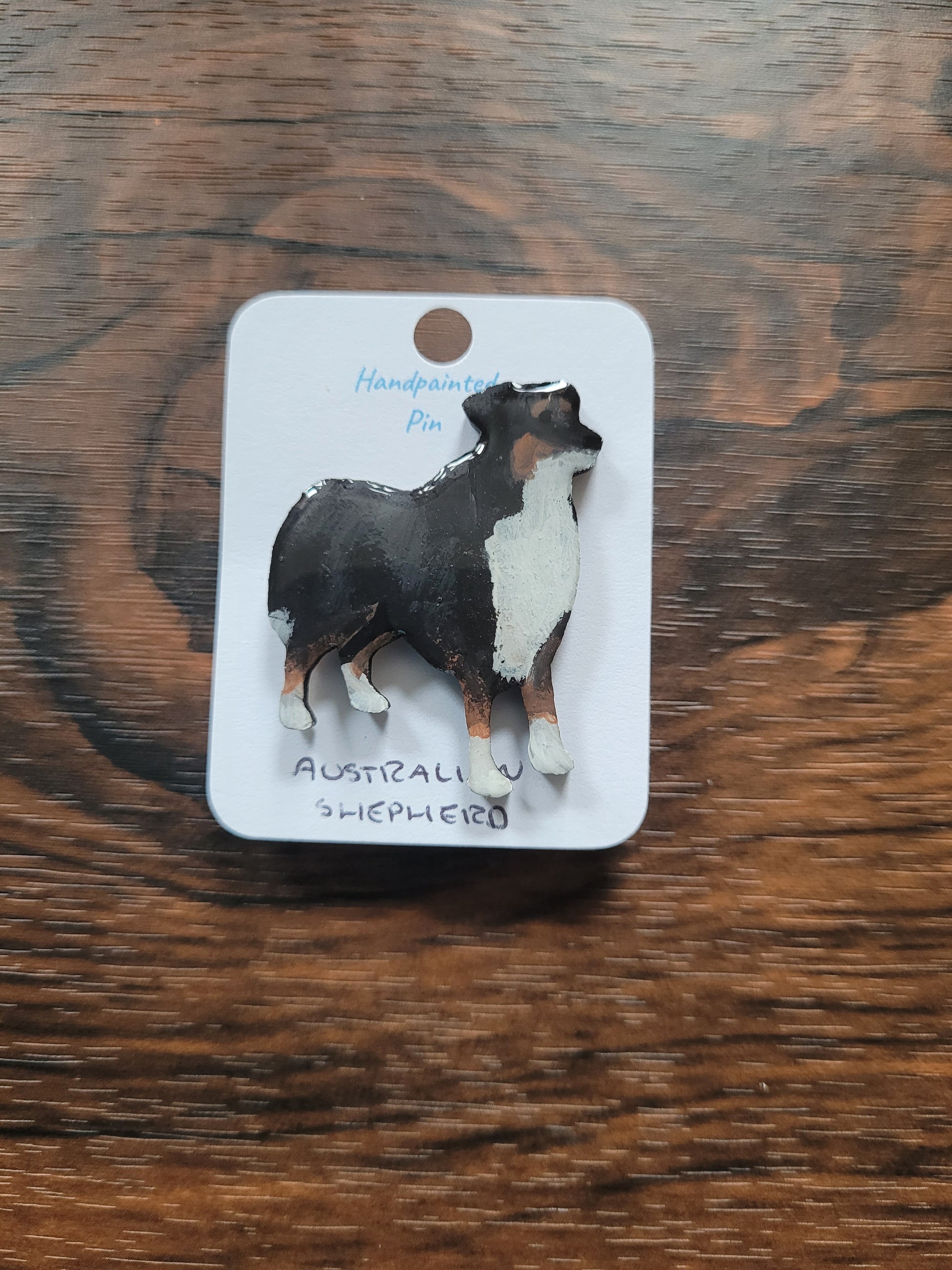 I paint each Australian Shepherd pin by hand onto wood, then finish it with a glossy resin varnish to help it shine and stay protected for years to come. Each one is about 4 cm in size, just the right little companion for your jacket, bag, or pin board.