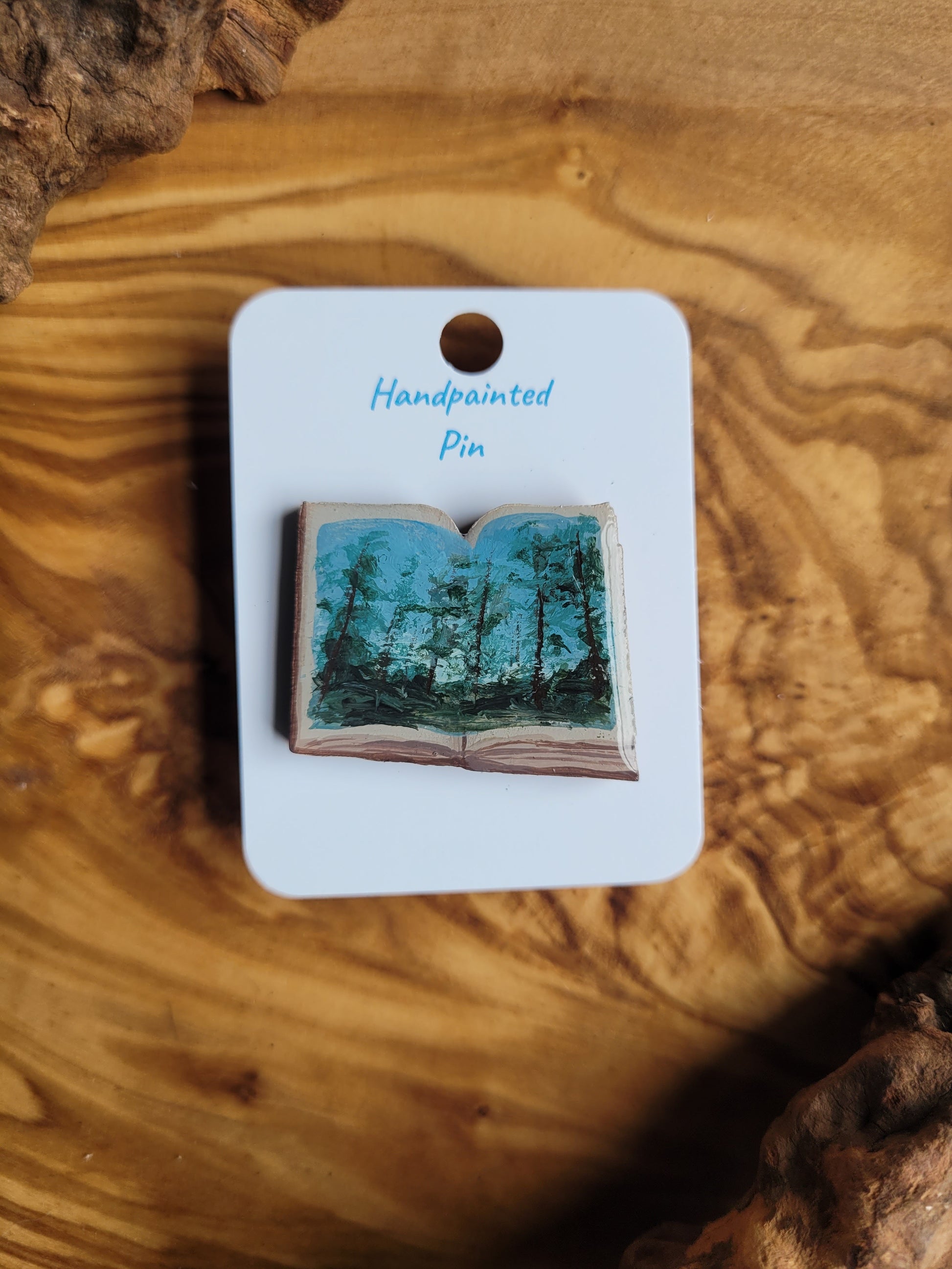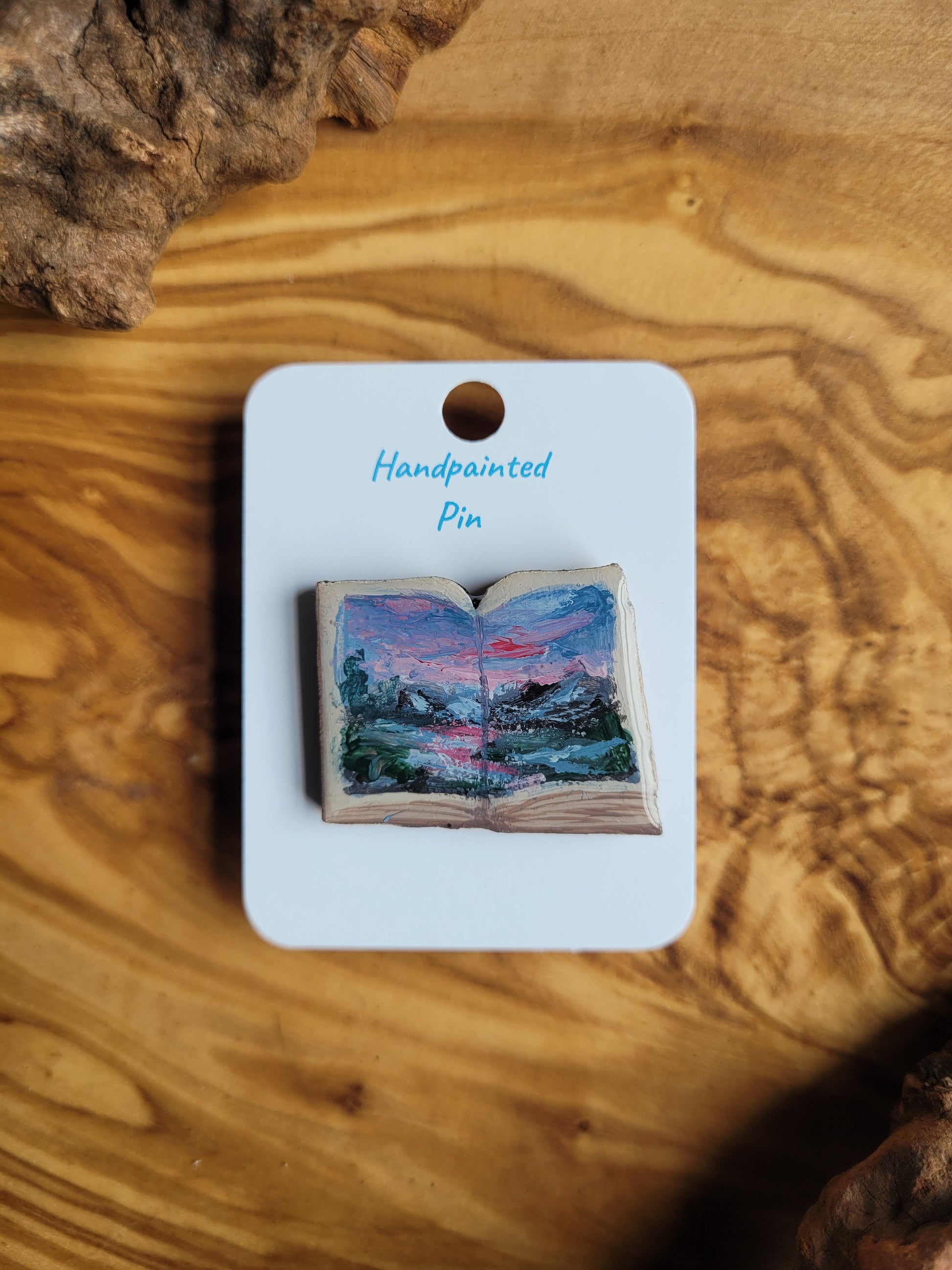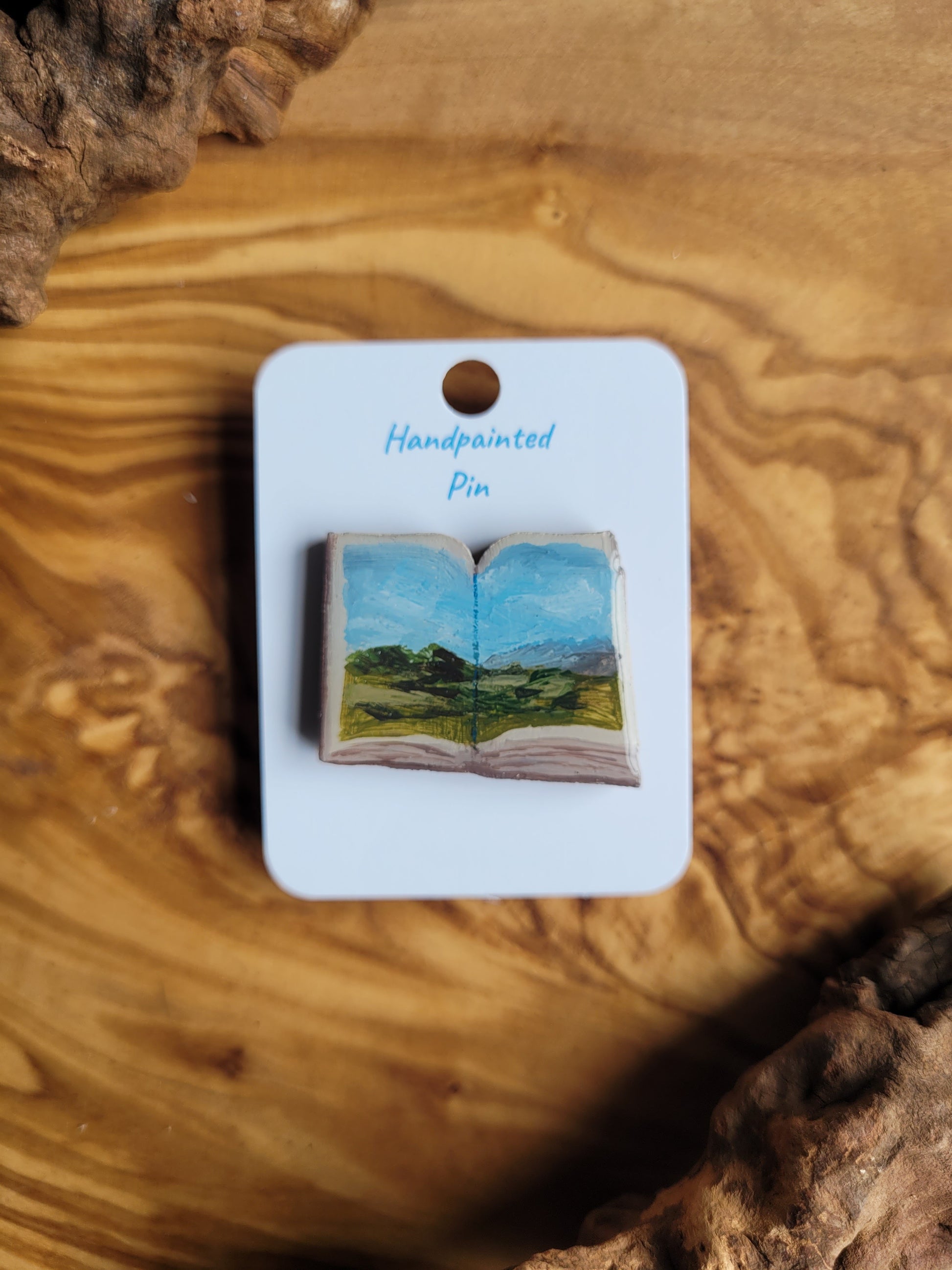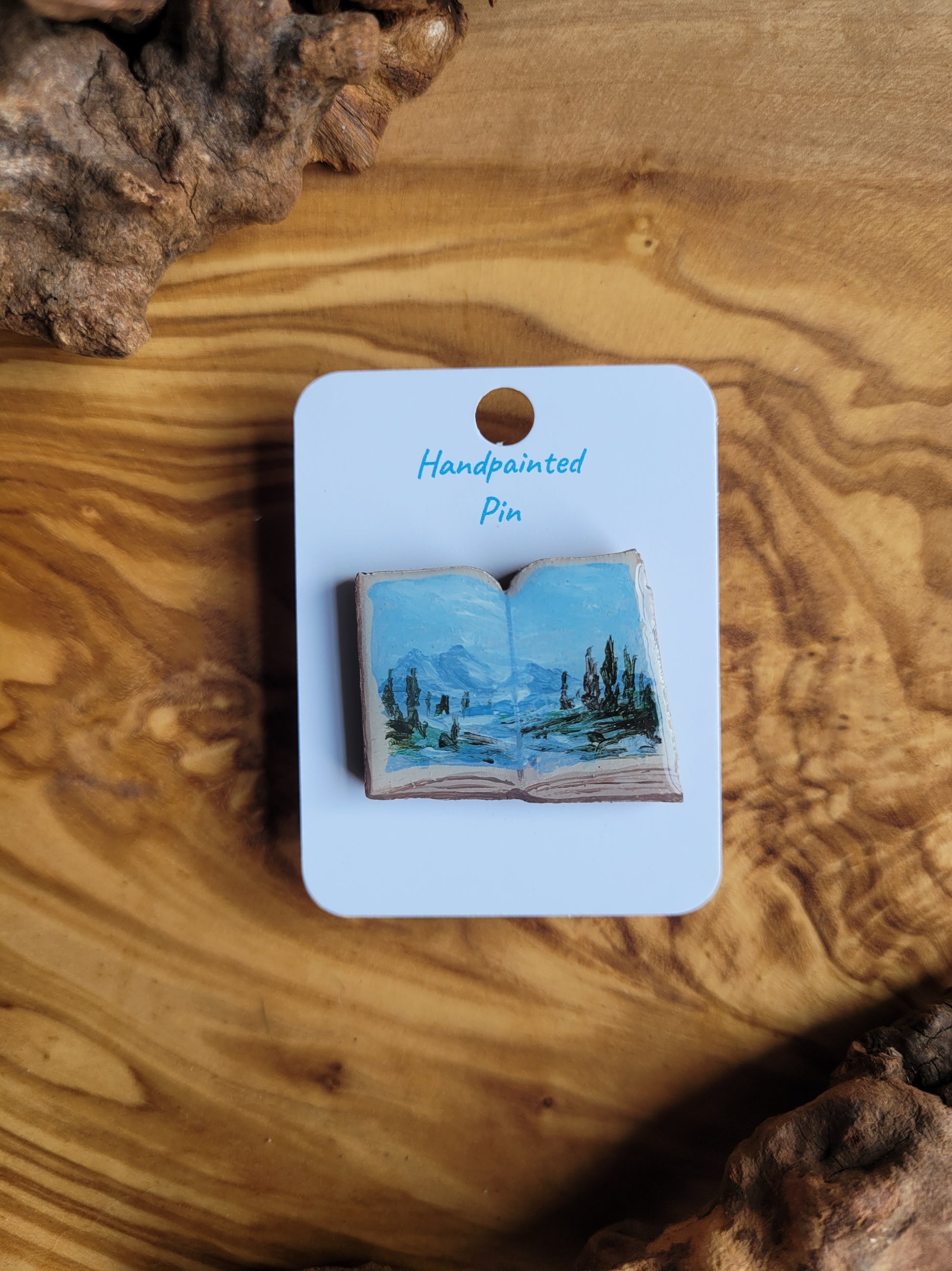 Each of these wooden pins features an open book design, hand-painted with care and sealed with a glossy resin varnish for durability and shine.