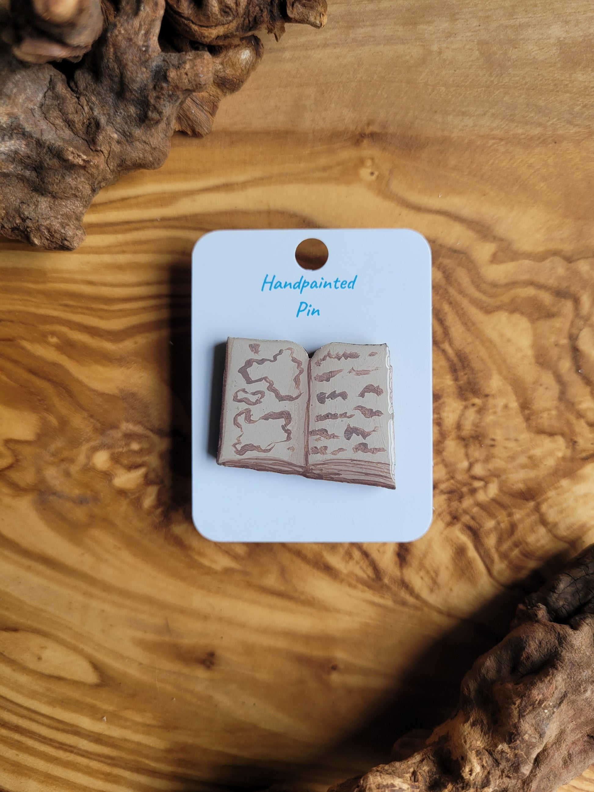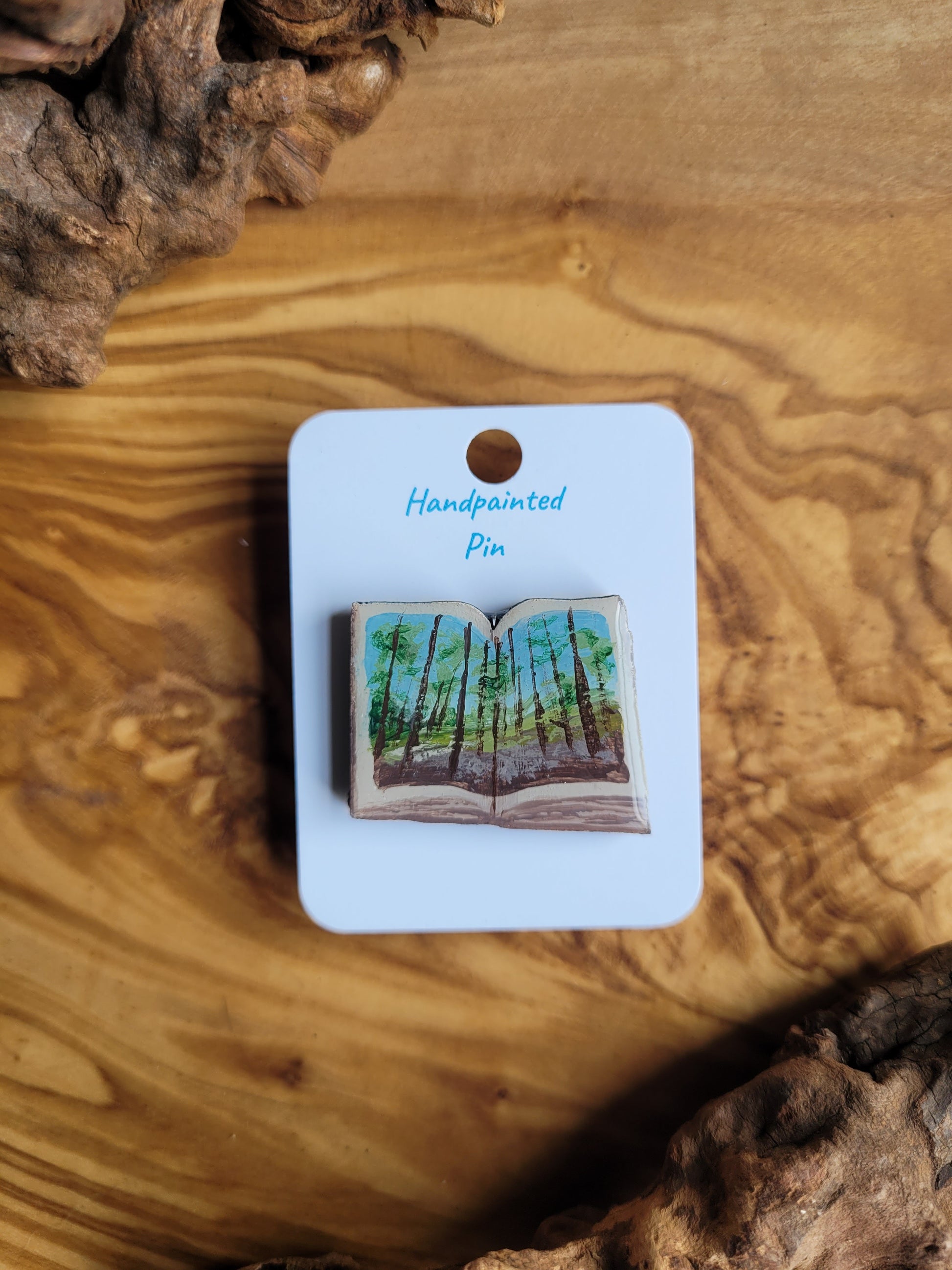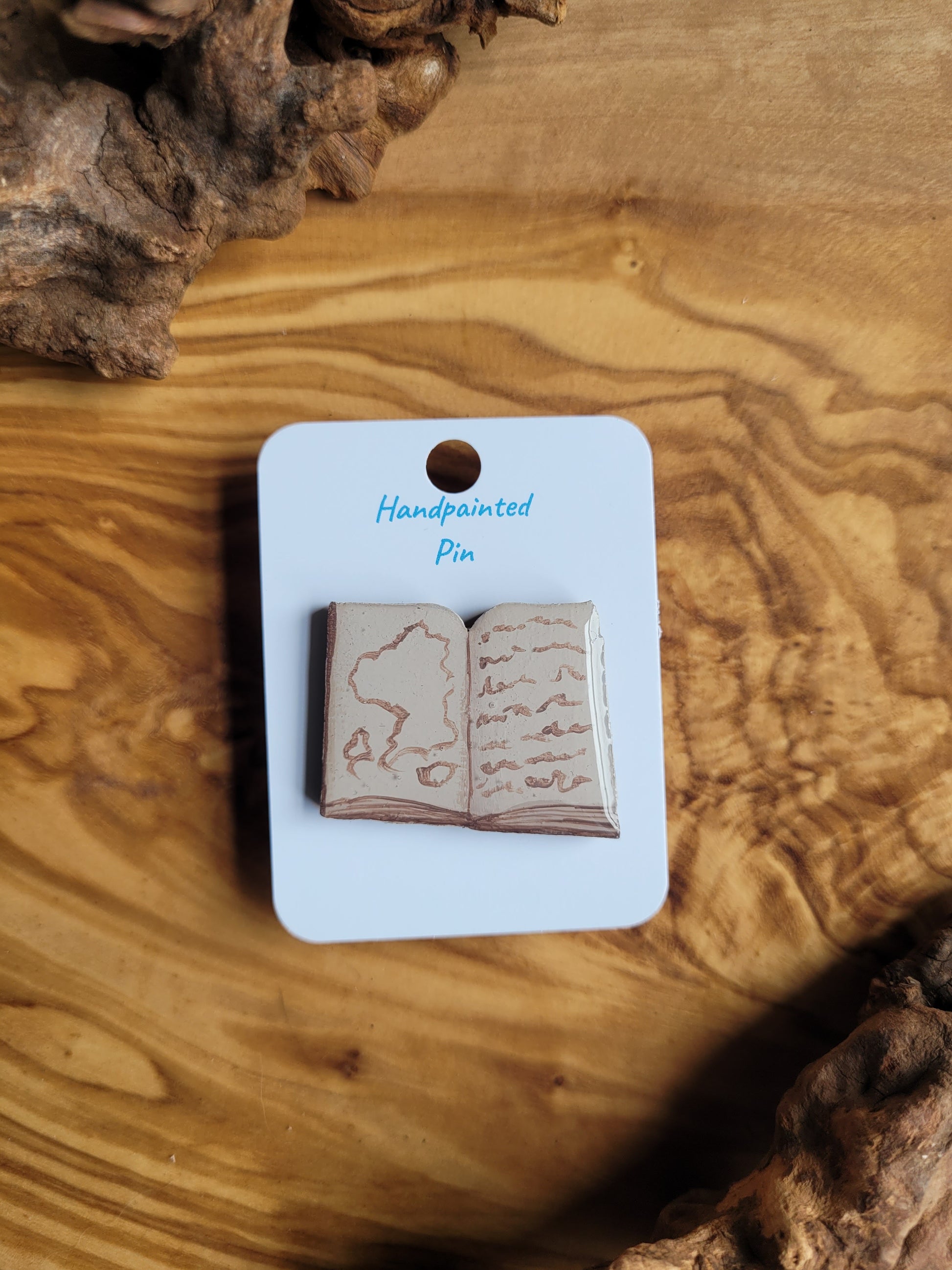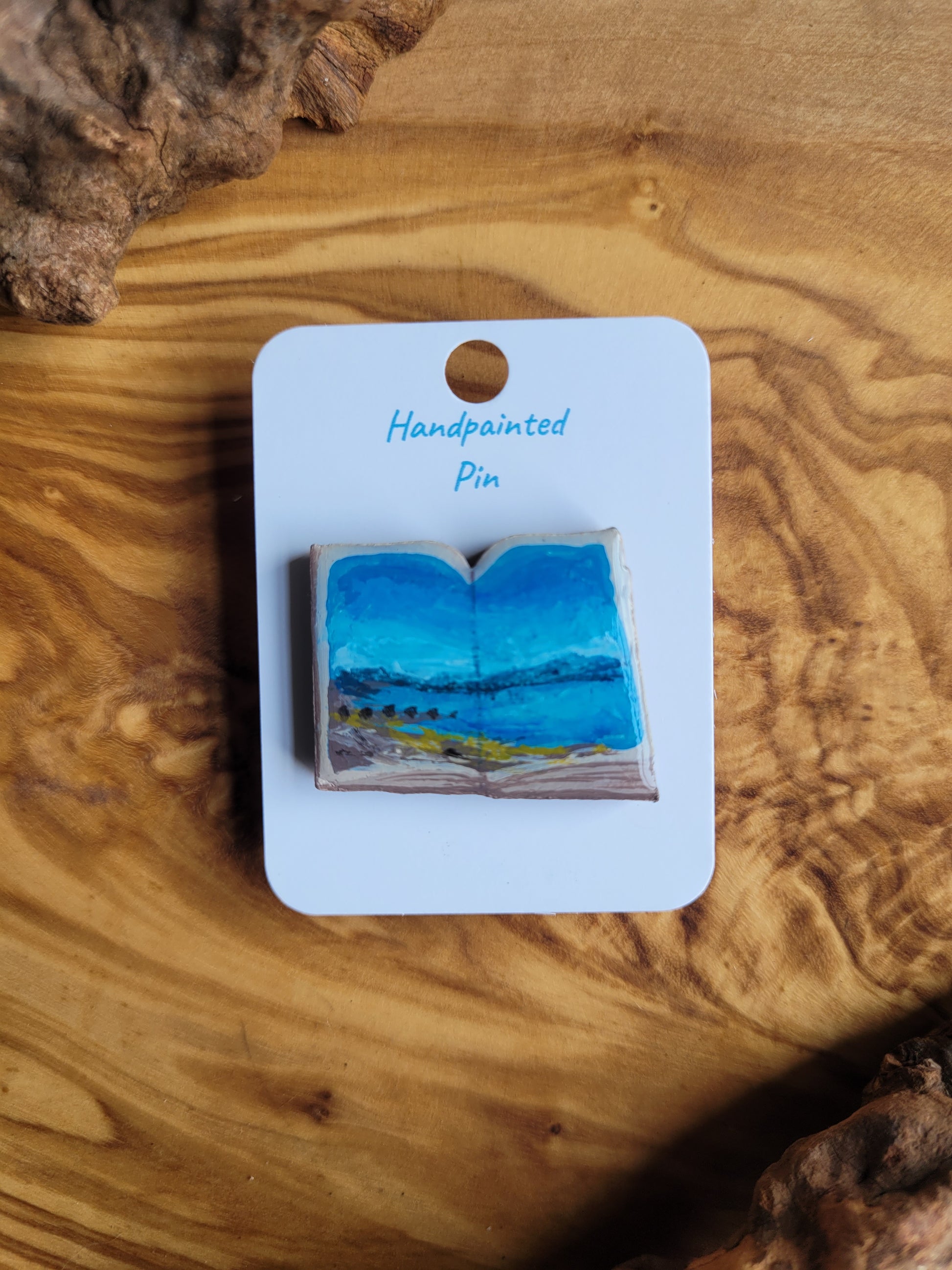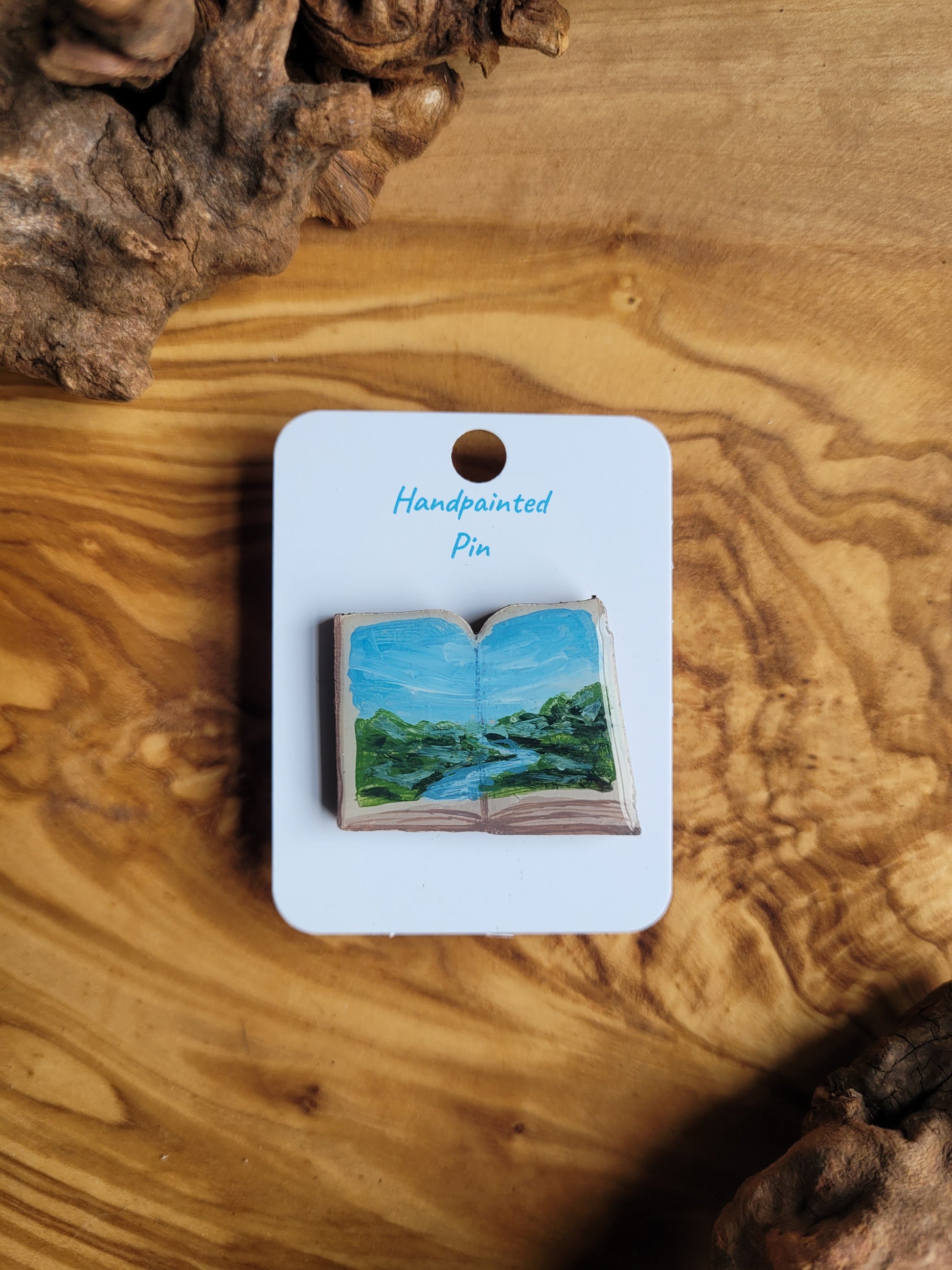 Each of these wooden pins features an open book design, hand-painted with care and sealed with a glossy resin varnish for durability and shine.