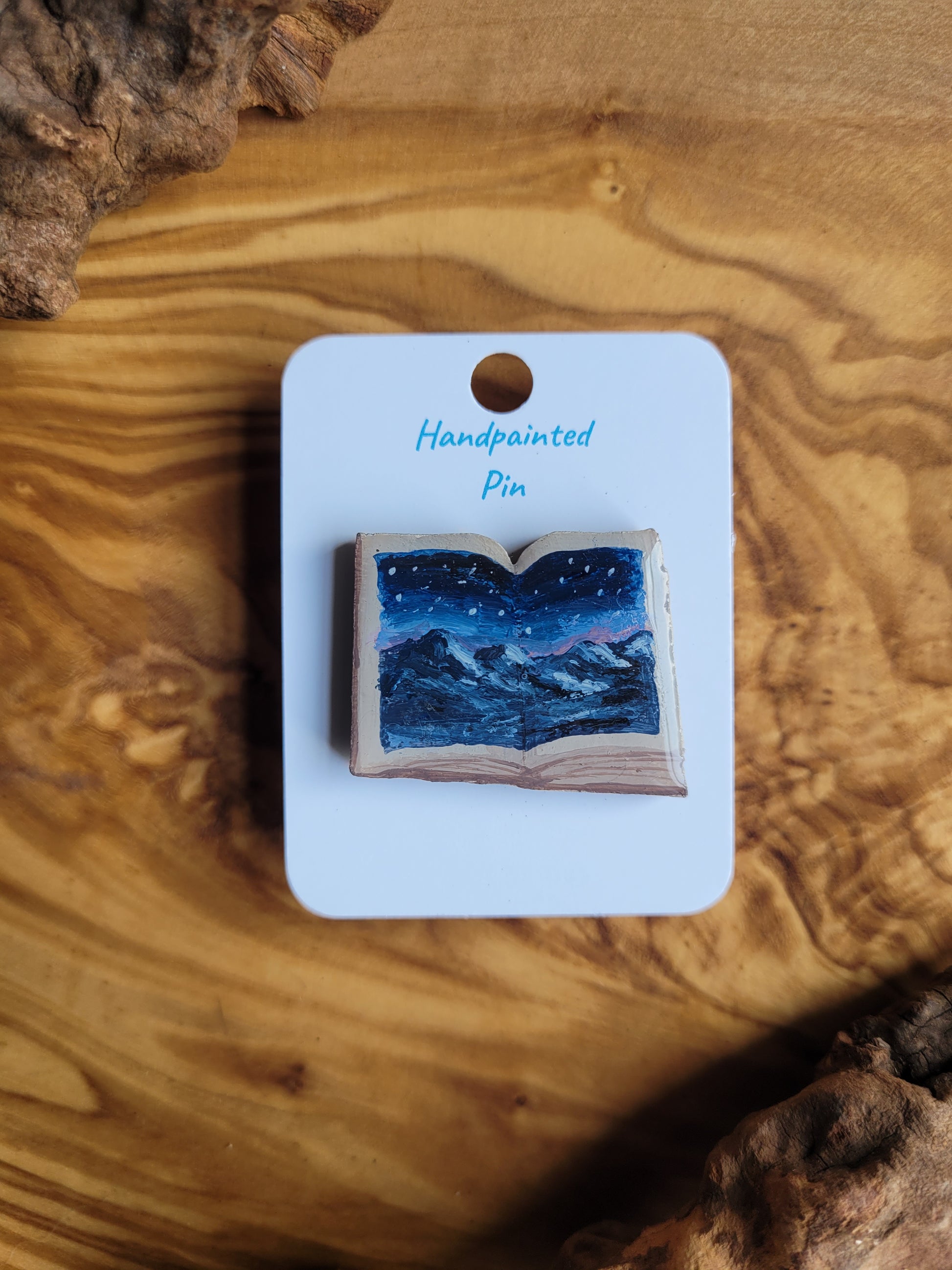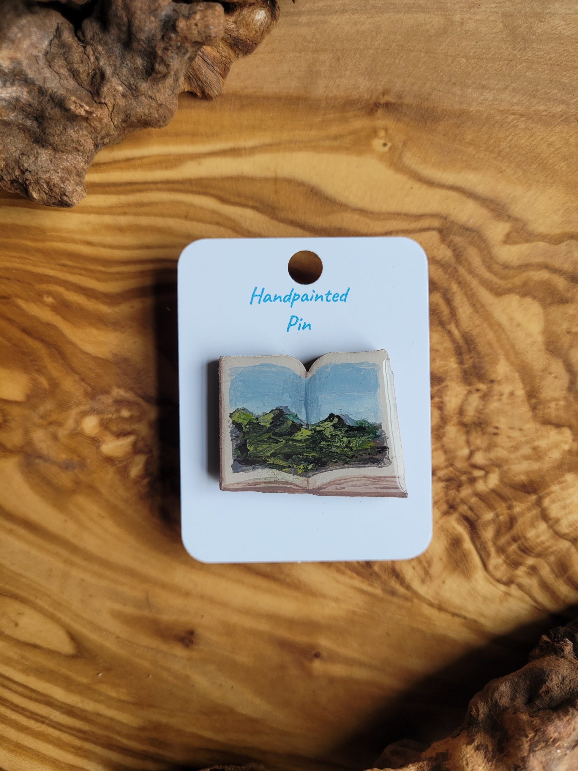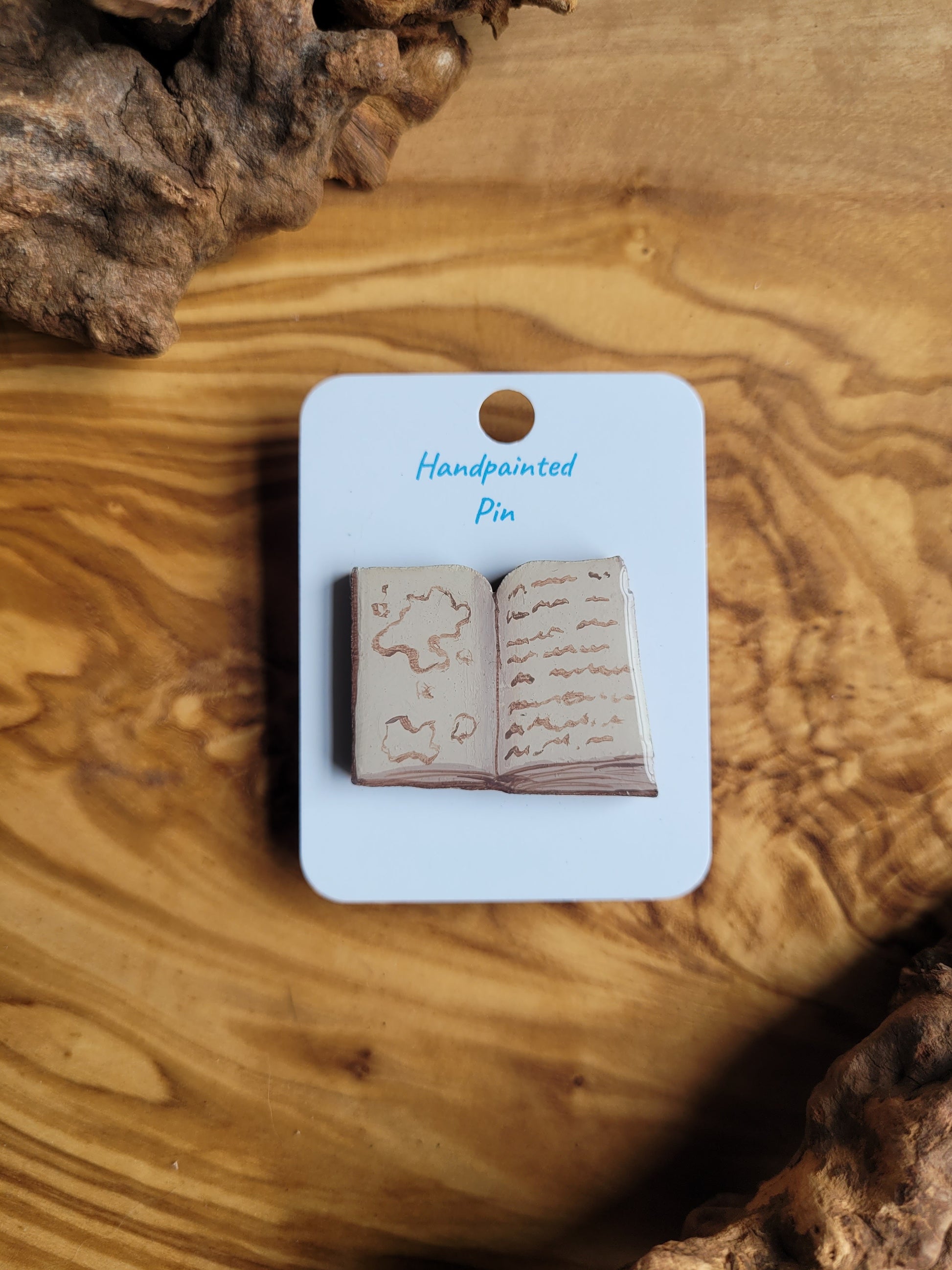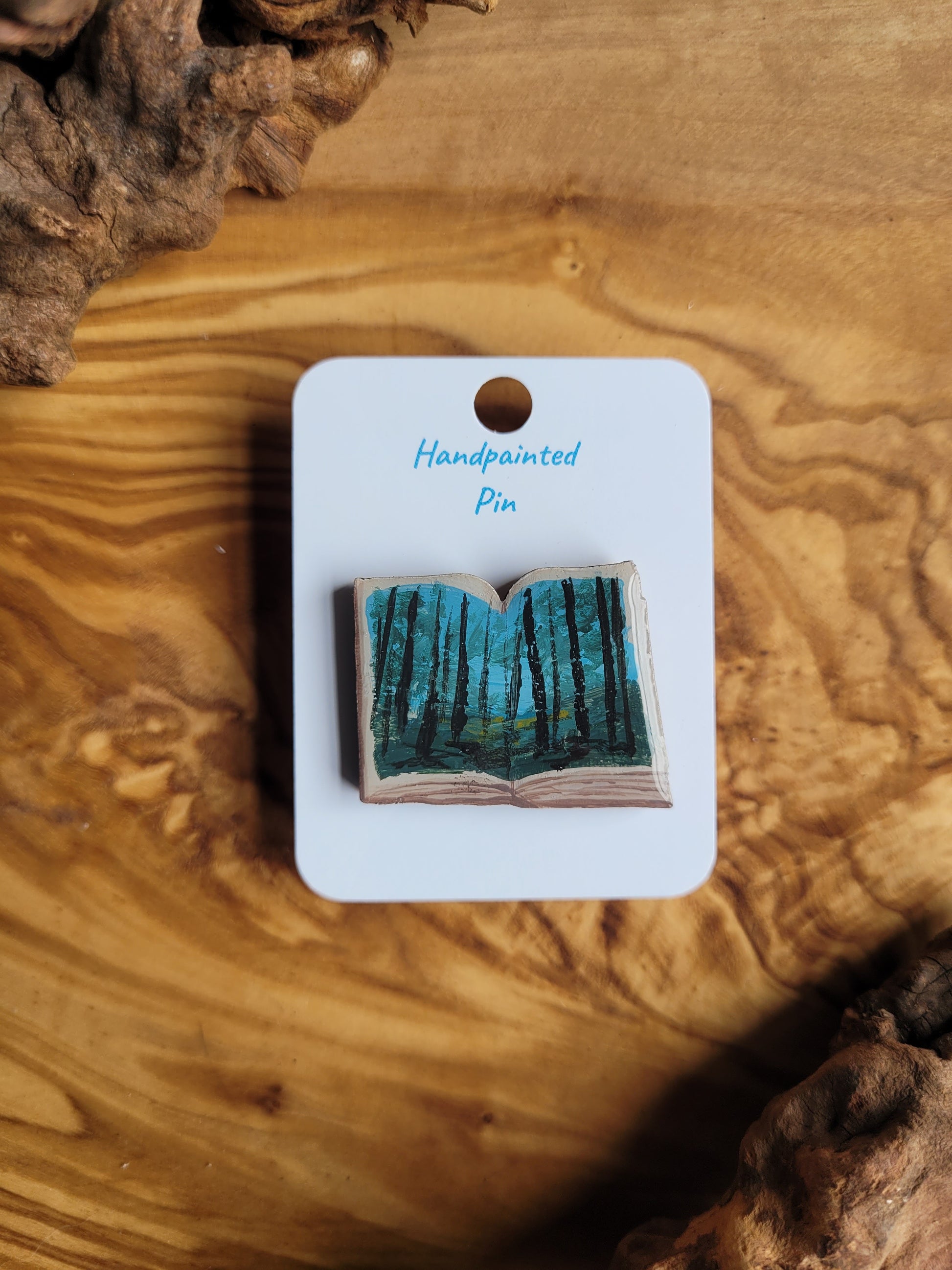 Each of these wooden pins features an open book design, hand-painted with care and sealed with a glossy resin varnish for durability and shine.