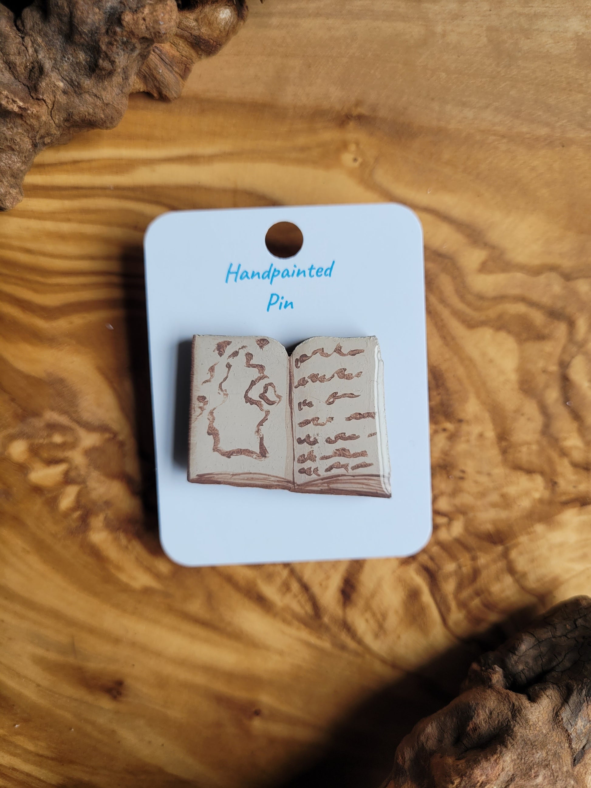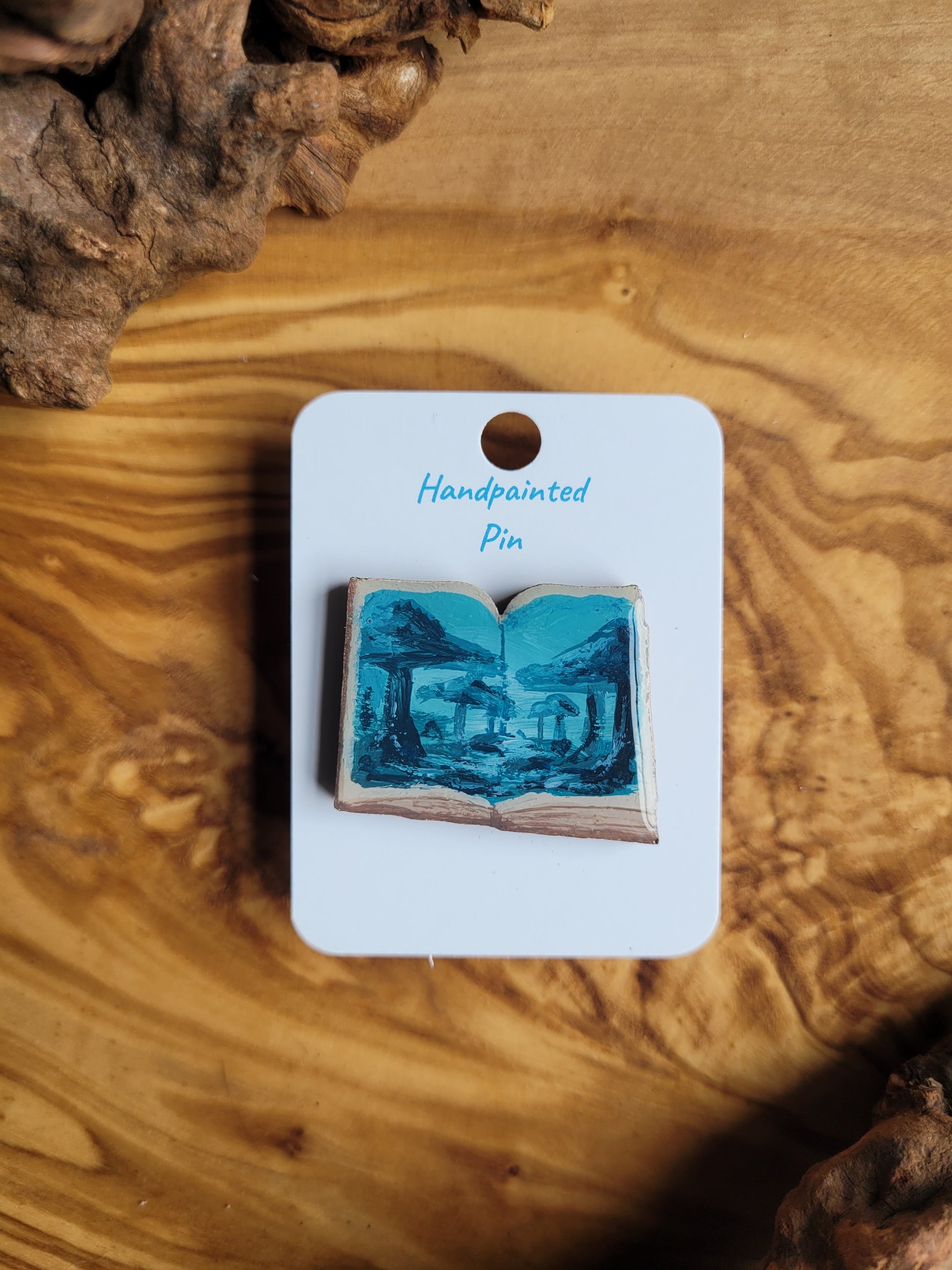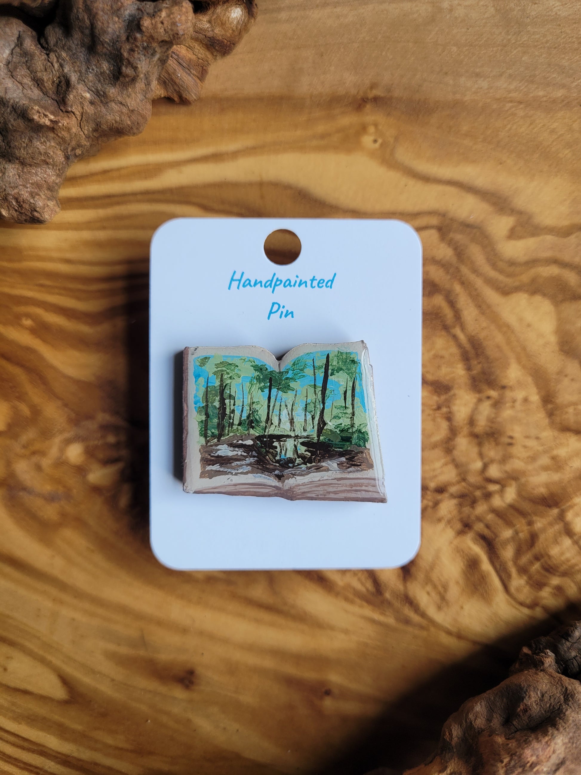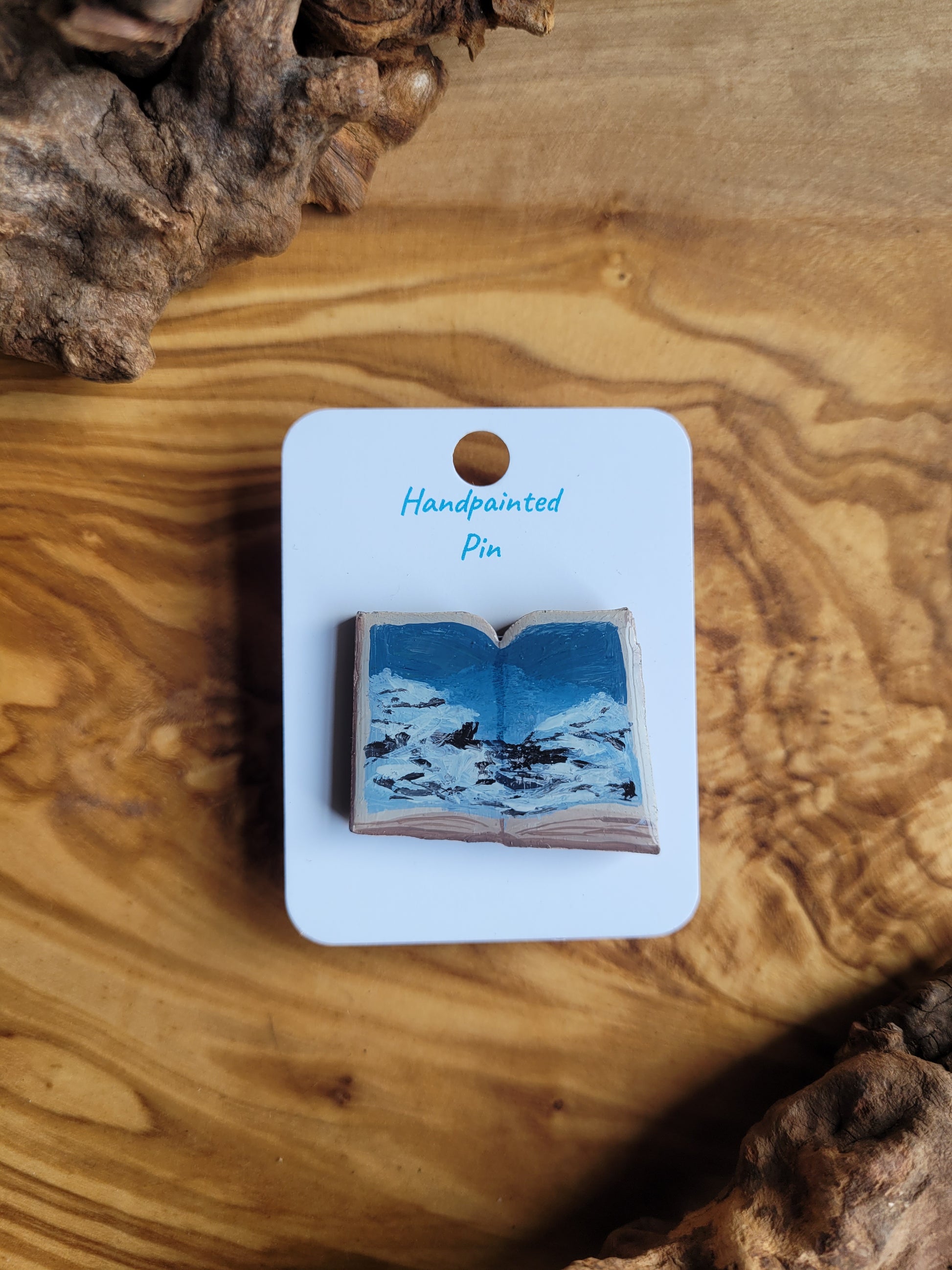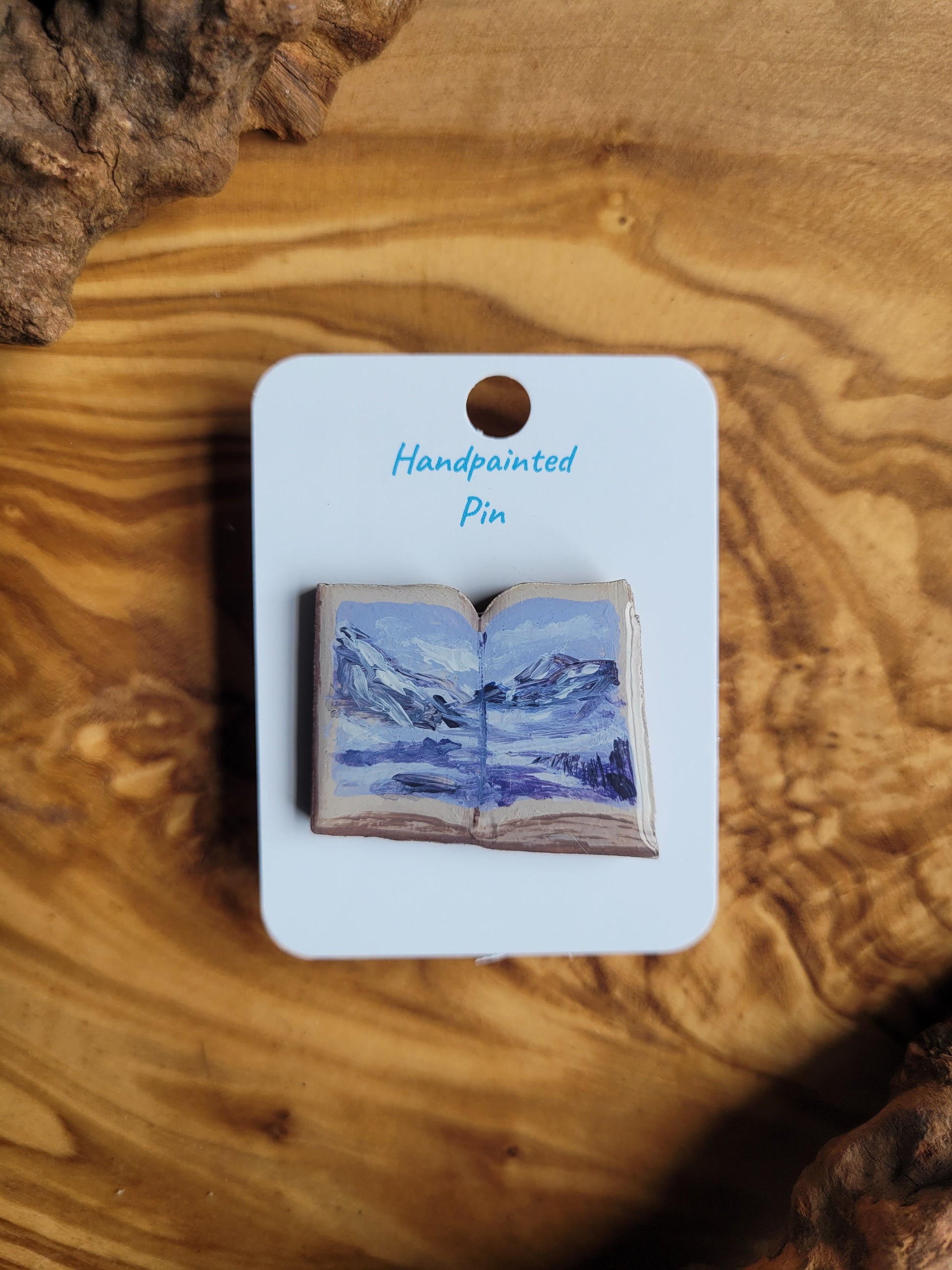 Each of these wooden pins features an open book design, hand-painted with care and sealed with a glossy resin varnish for durability and shine.