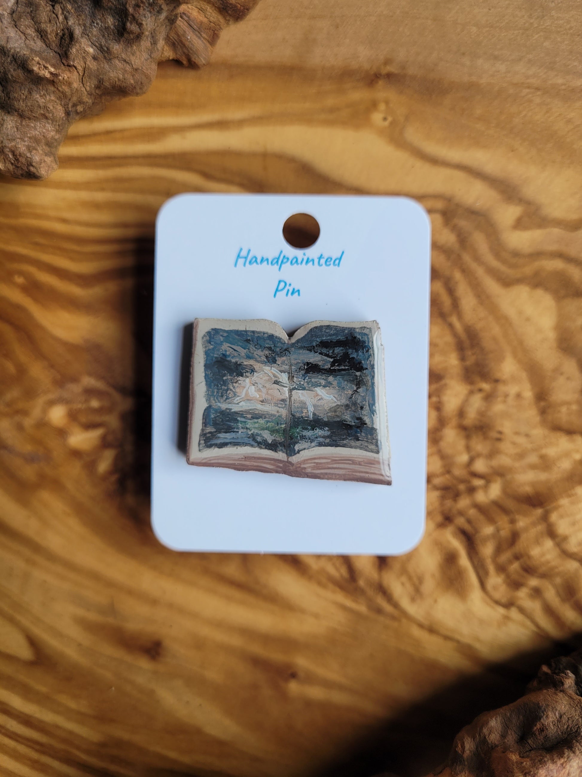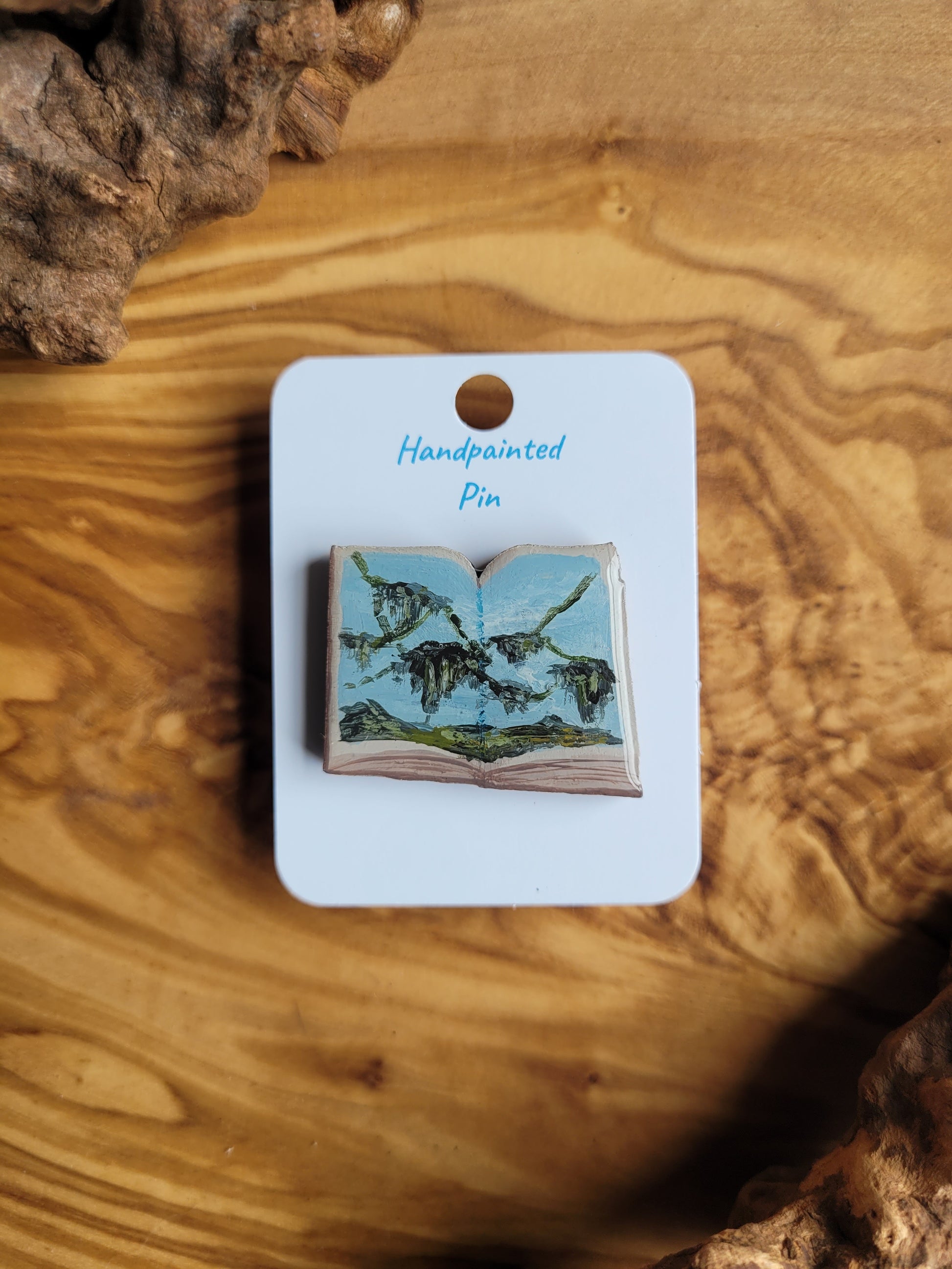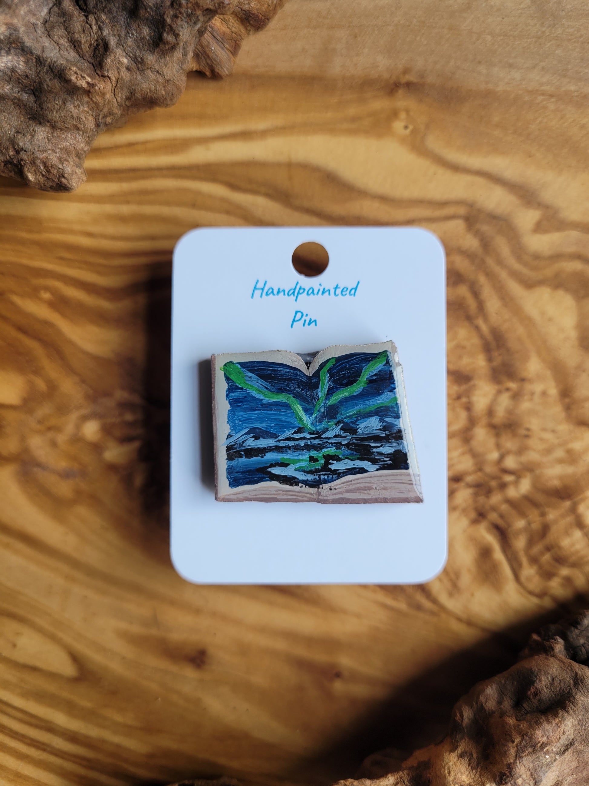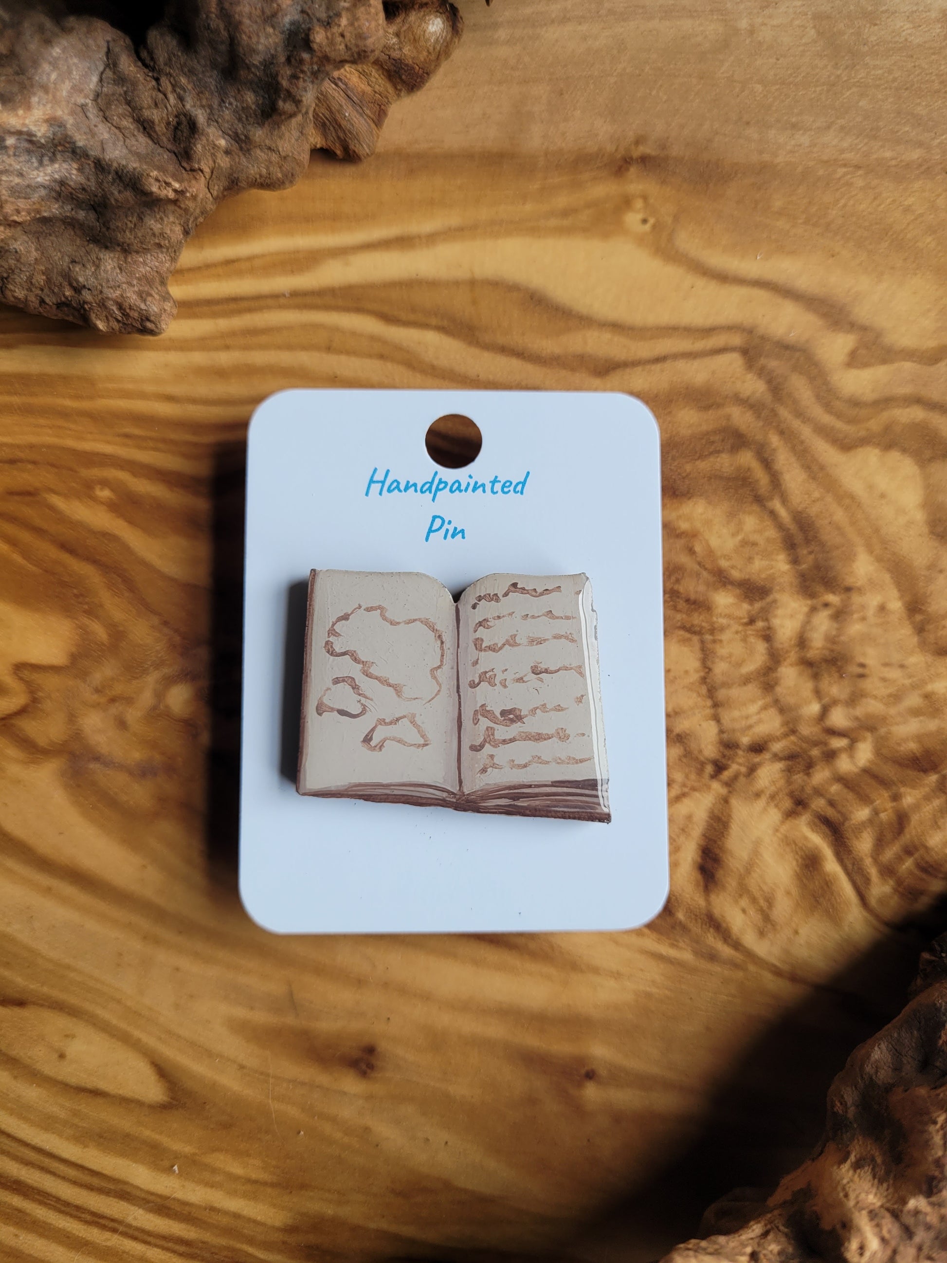 Each of these wooden pins features an open book design, hand-painted with care and sealed with a glossy resin varnish for durability and shine.