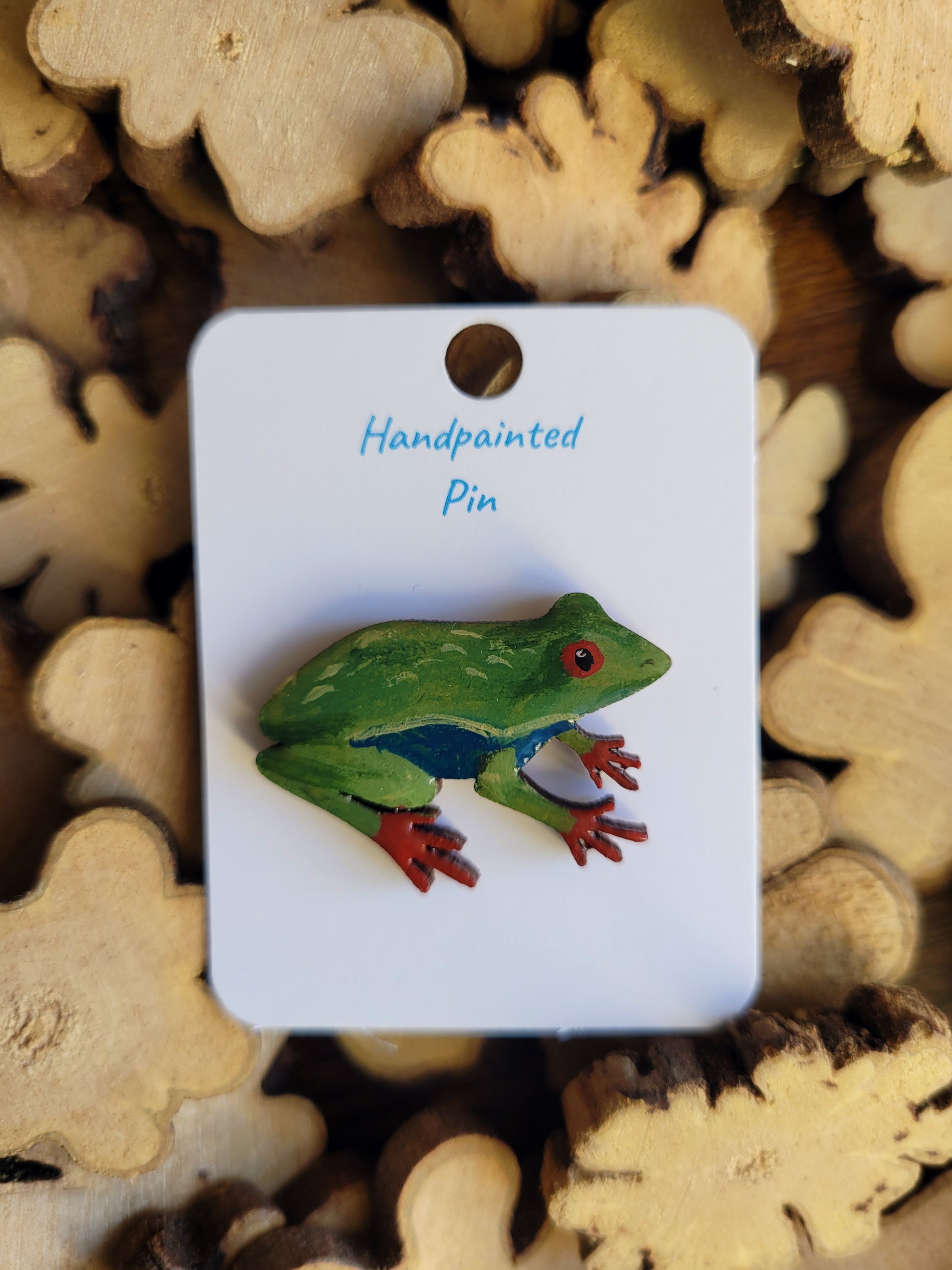 I paint each Frog pin by hand onto wood, then finish it with a glossy resin varnish to help it shine and stay protected for years to come. Each one is about 4 cm in size, just the right little companion for your jacket, bag, or pin board.