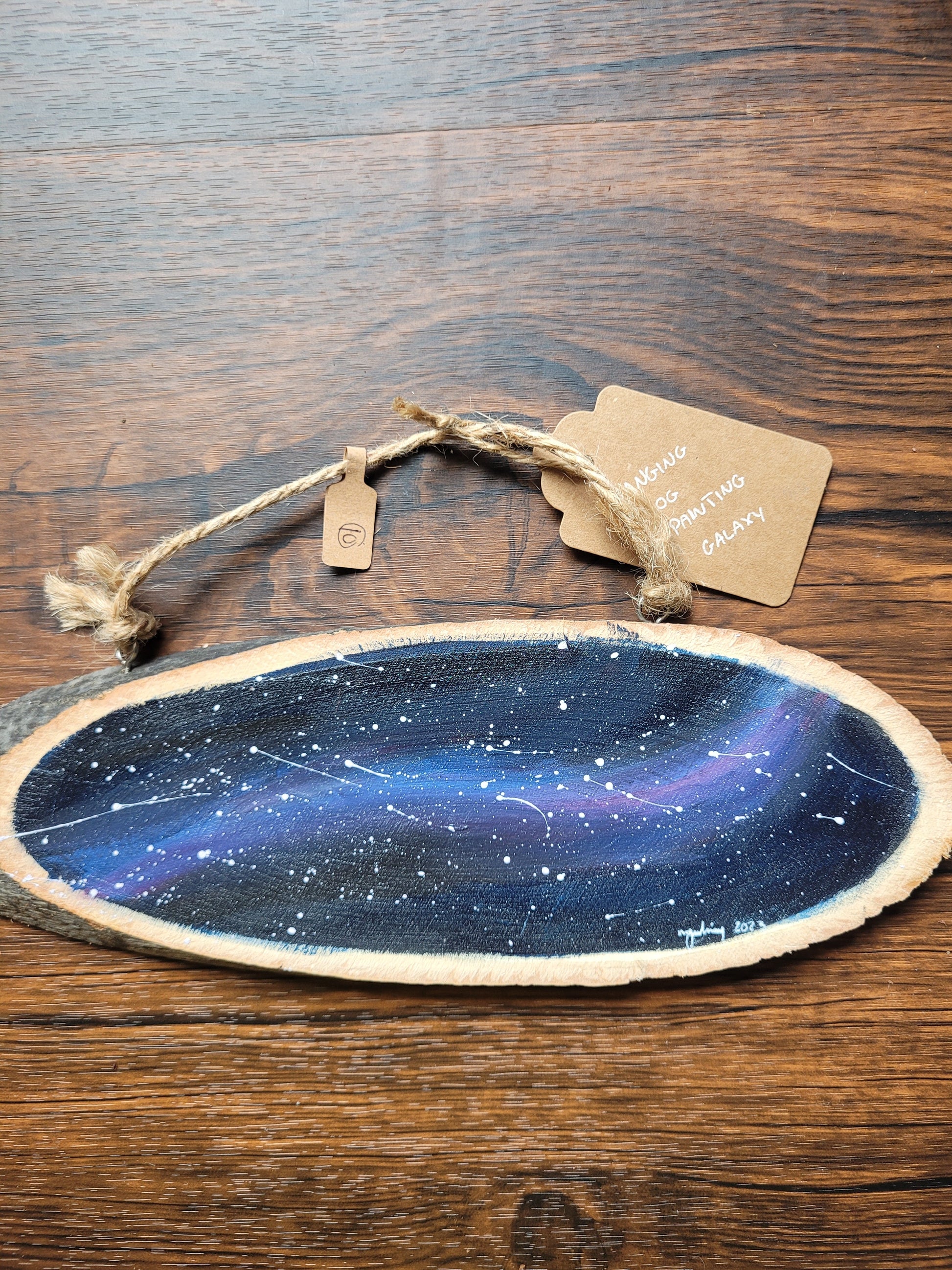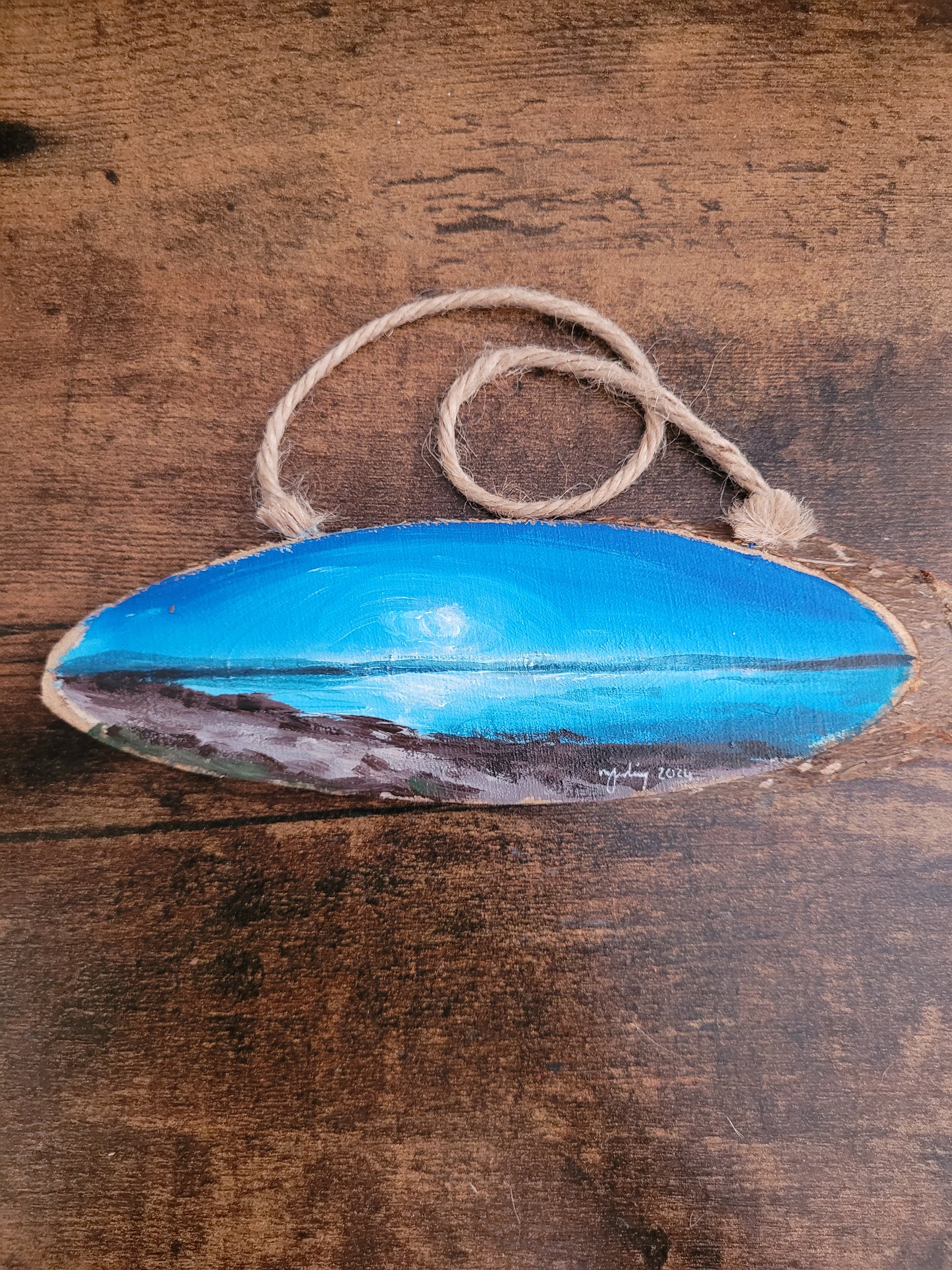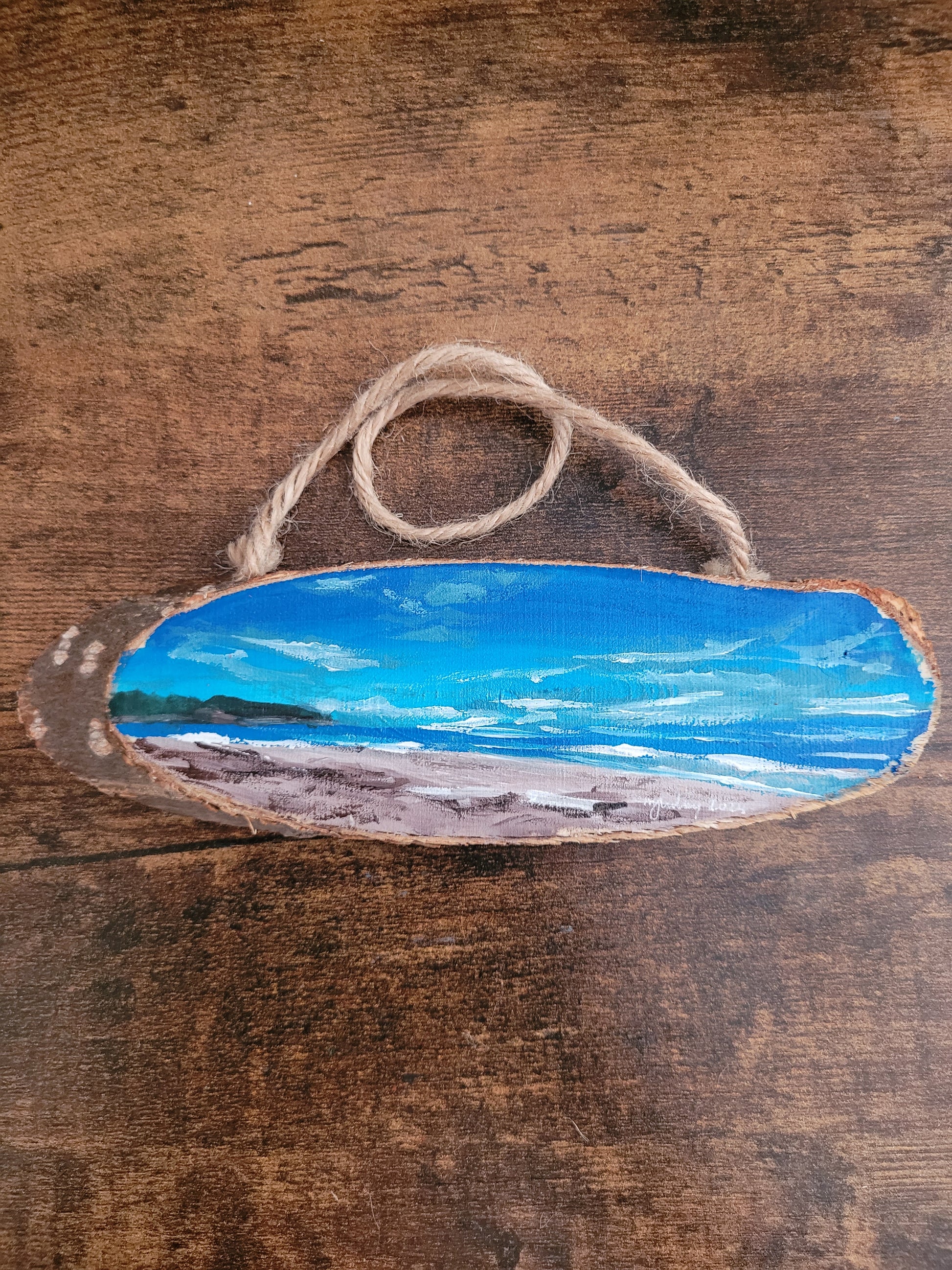 Each hanging log is painted by hand using acrylics on a natural wood slice, then sealed with varnish for protection and a subtle sheen.