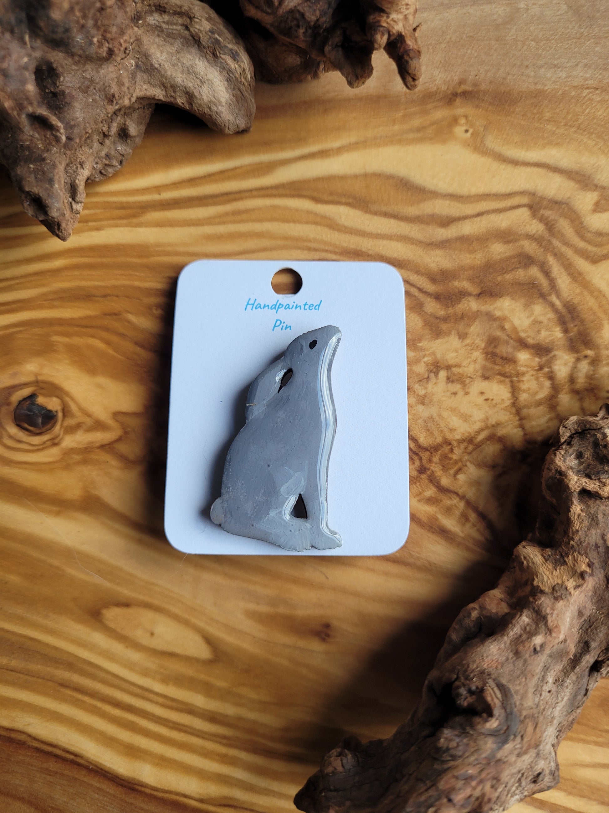I paint each Hare pin by hand onto wood, then finish it with a glossy resin varnish to help it shine and stay protected for years to come. Each one is about 4 cm in size, just the right little companion for your jacket, bag, or pin board.