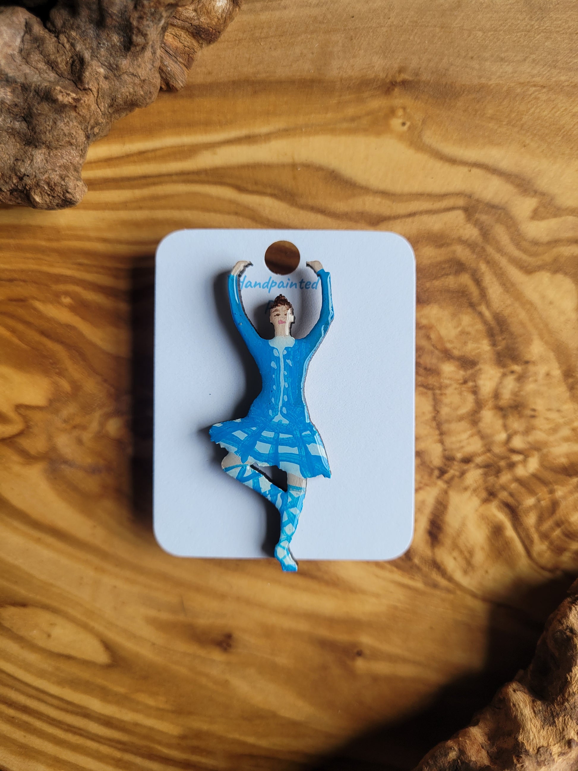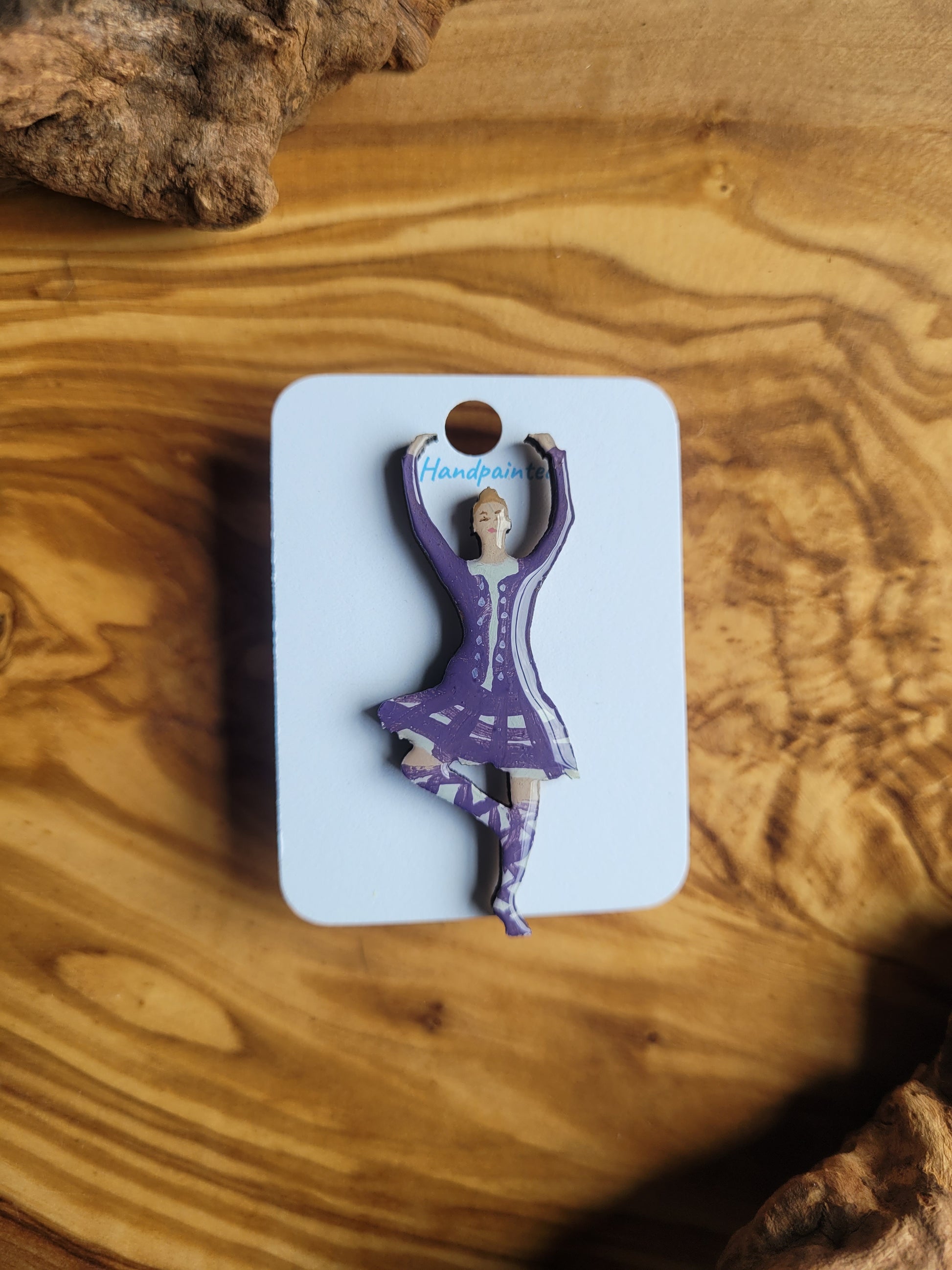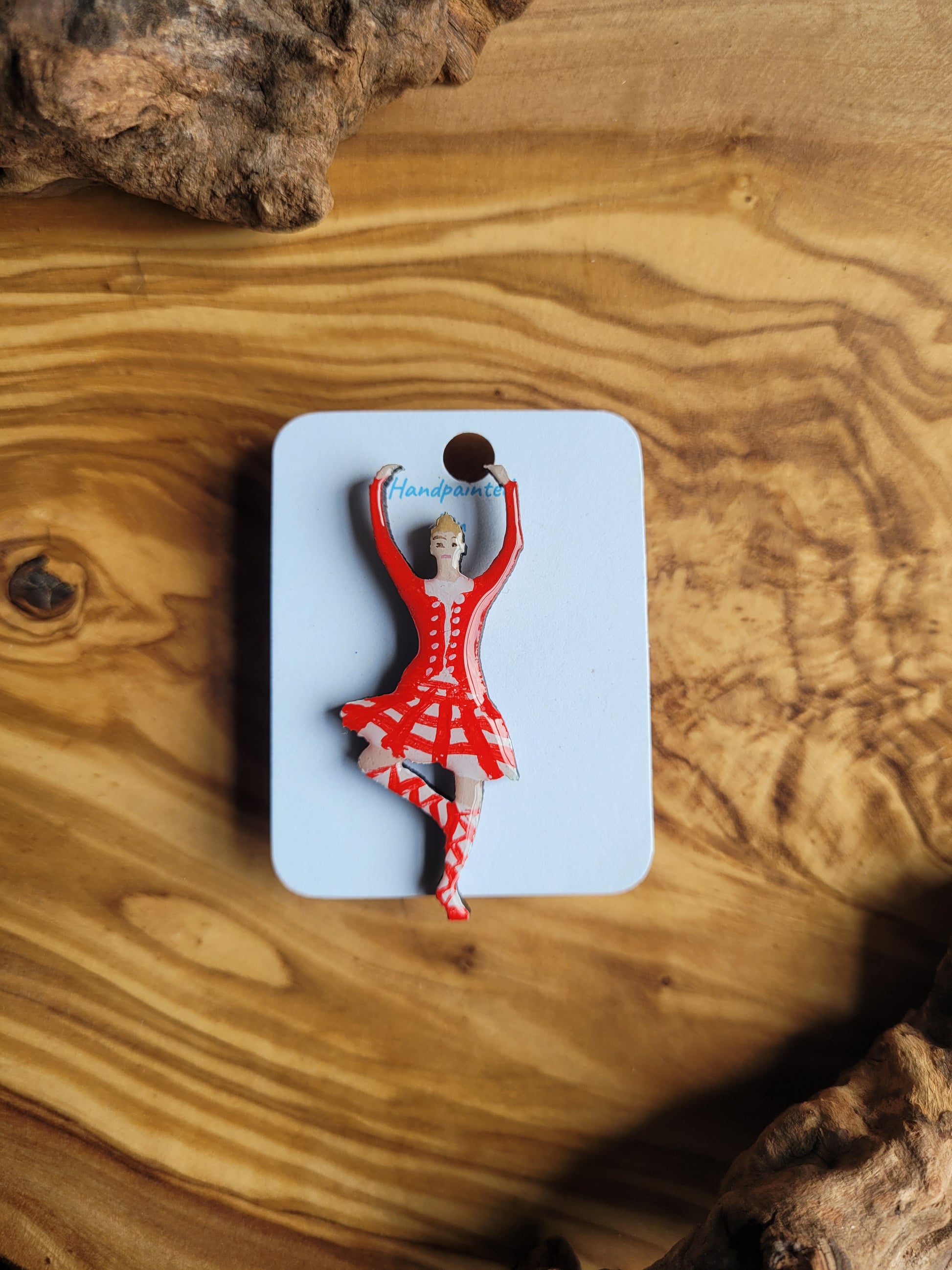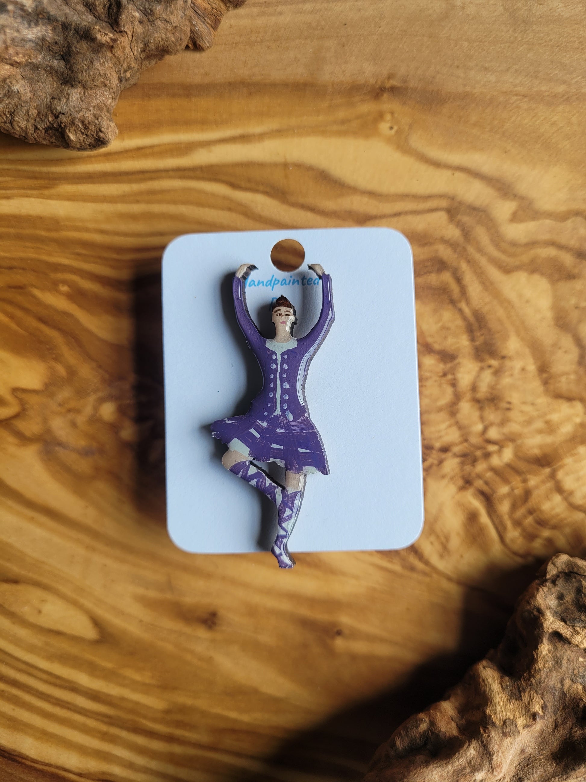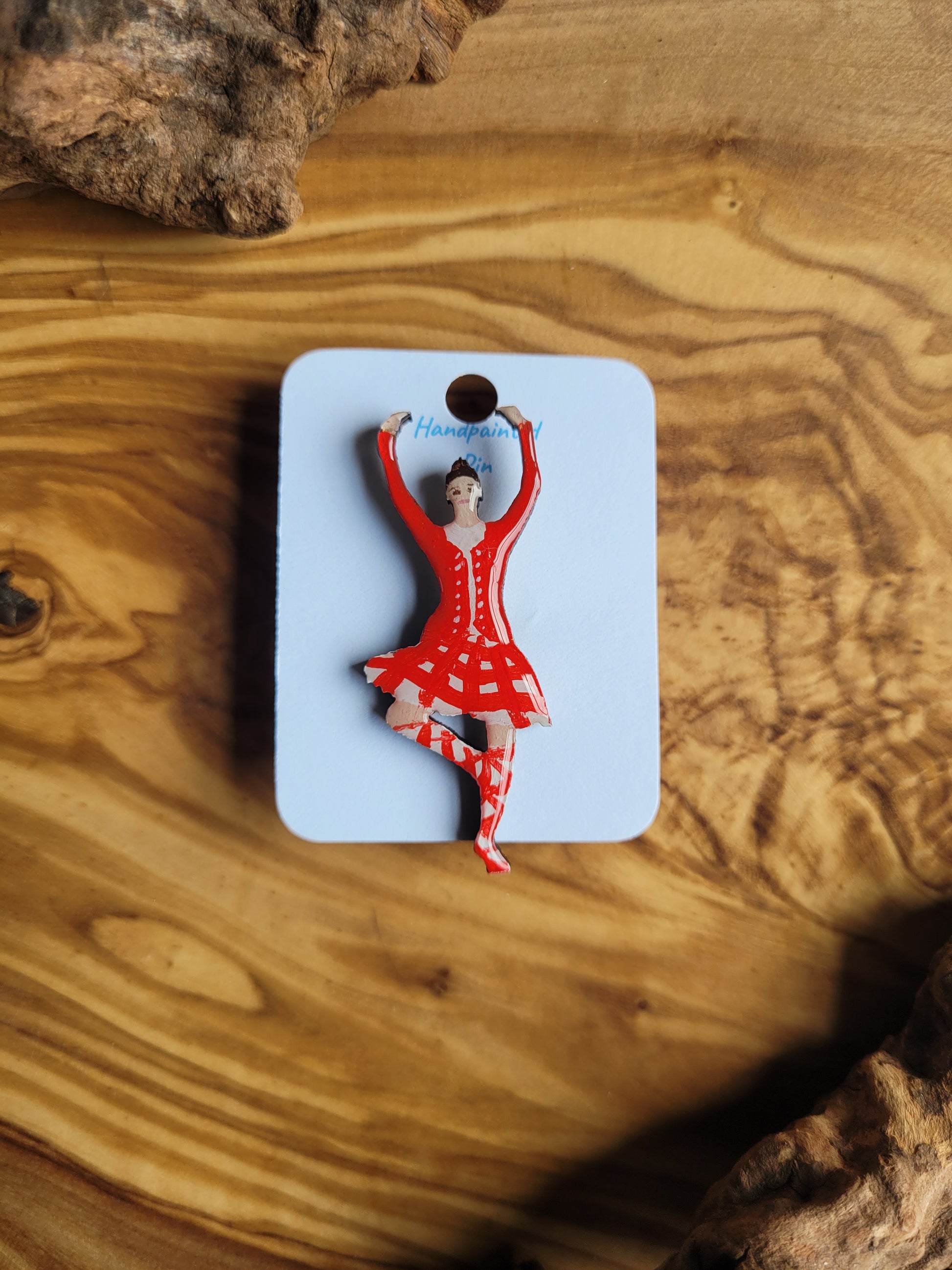 I paint each Highland Dancer pin by hand onto wood, then finish it with a glossy resin varnish to help it shine and stay protected for years to come. Each one is about 5 cm in size, just the right little companion for your jacket, bag, or pin board.