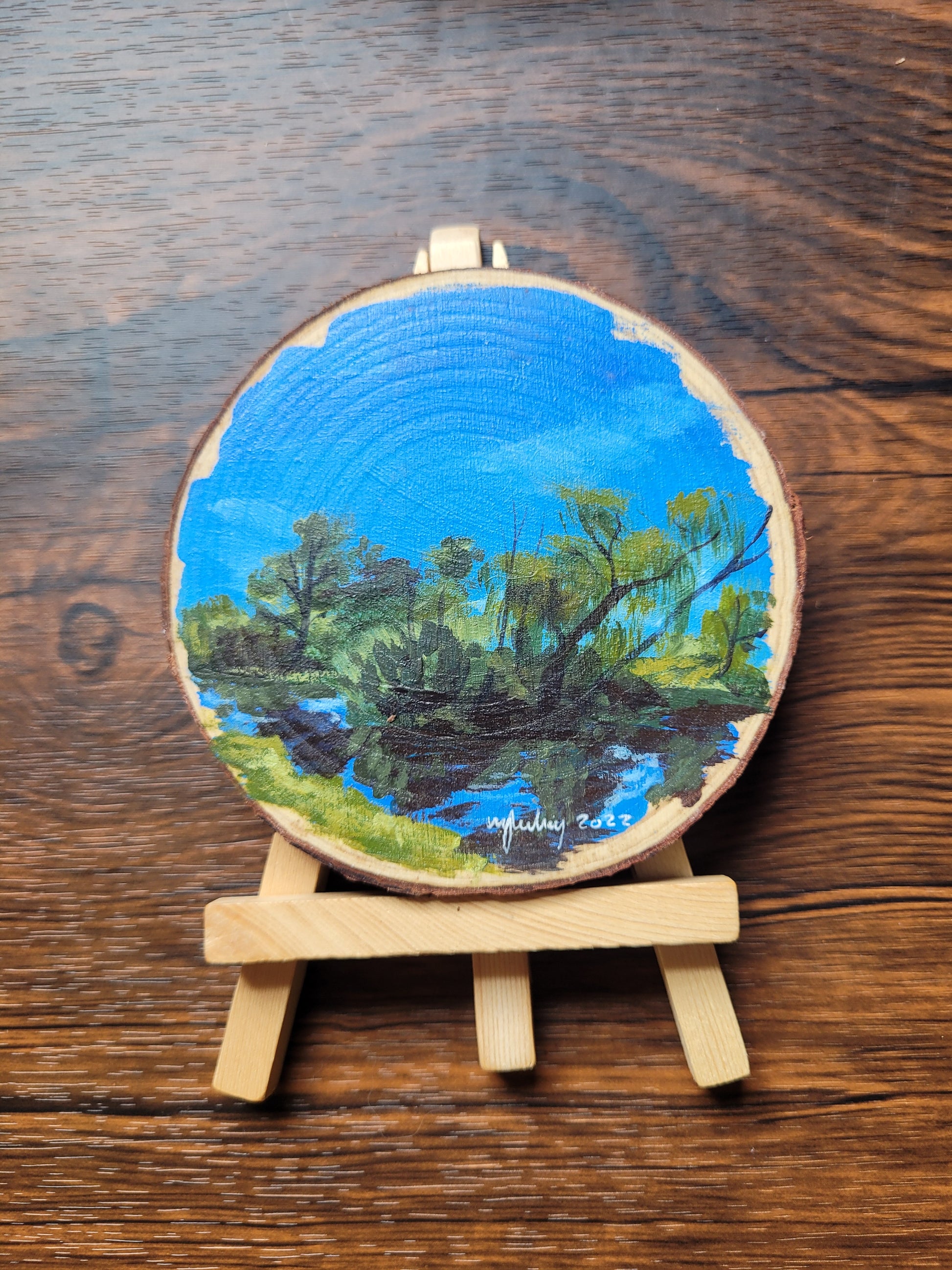 Each log slice is painted with acrylics on a natural piece of wood, approximately 10 cm in size, and comes with a small display easel, ready to brighten up your shelf, desk, or mantel.