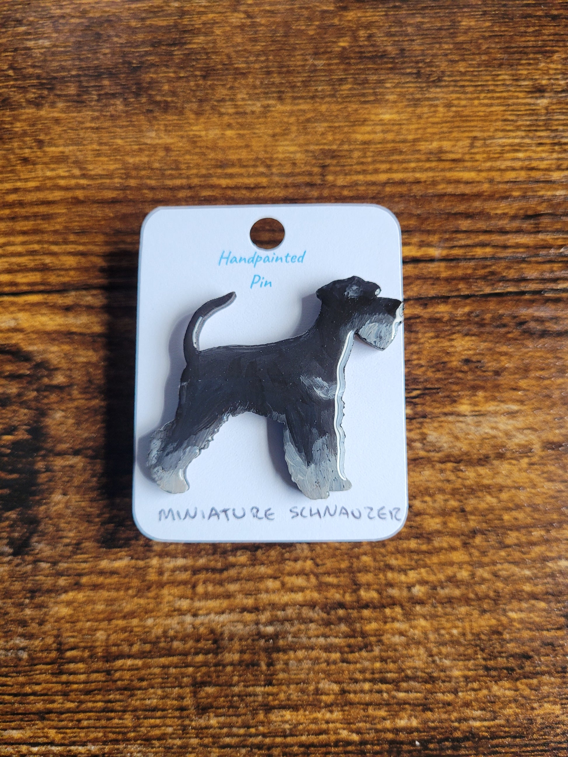 I paint each Minature Schnauzer pin by hand onto wood, then finish it with a glossy resin varnish to help it shine and stay protected for years to come. Each one is about 4 cm in size, just the right little companion for your jacket, bag, or pin board.