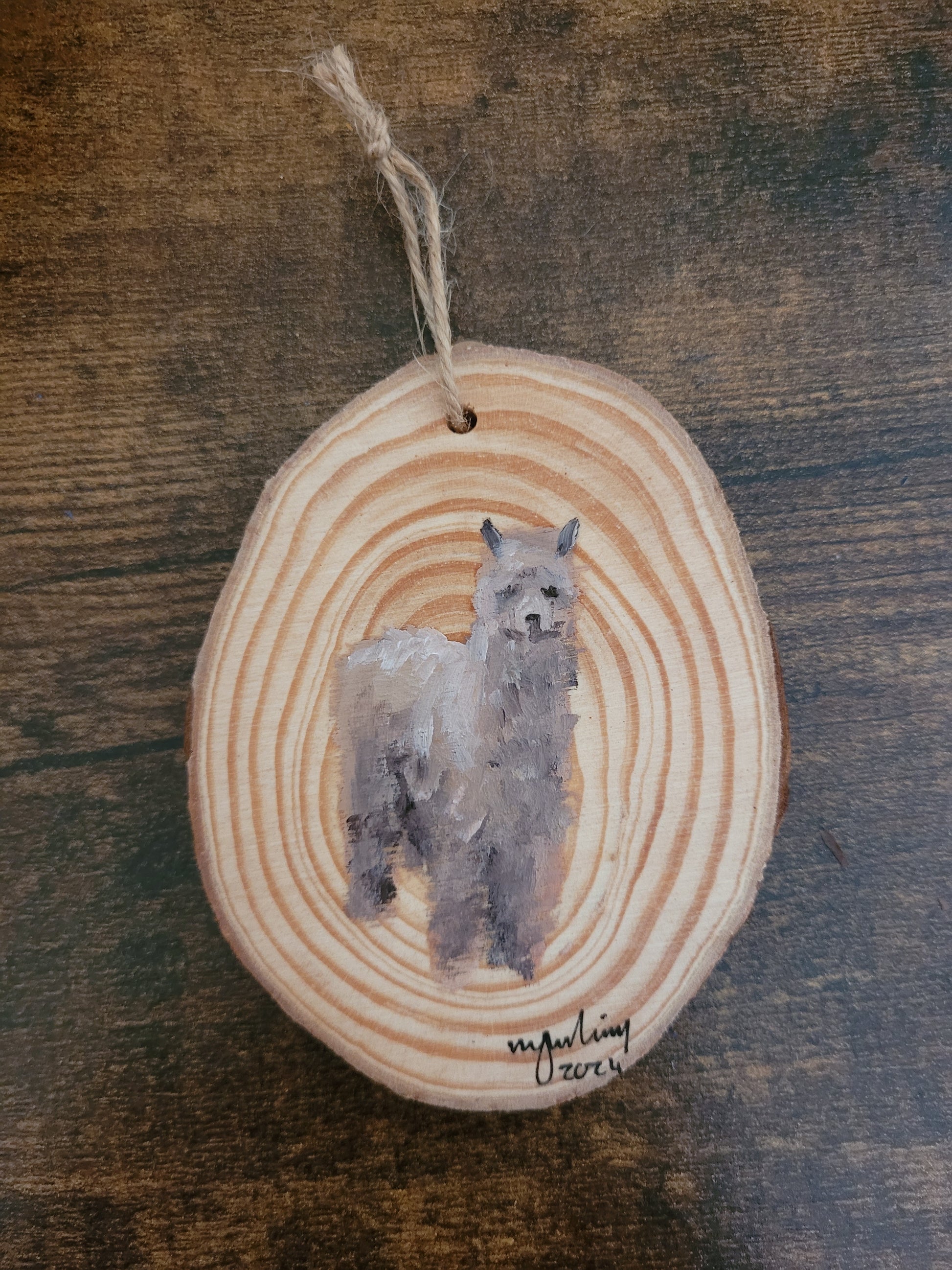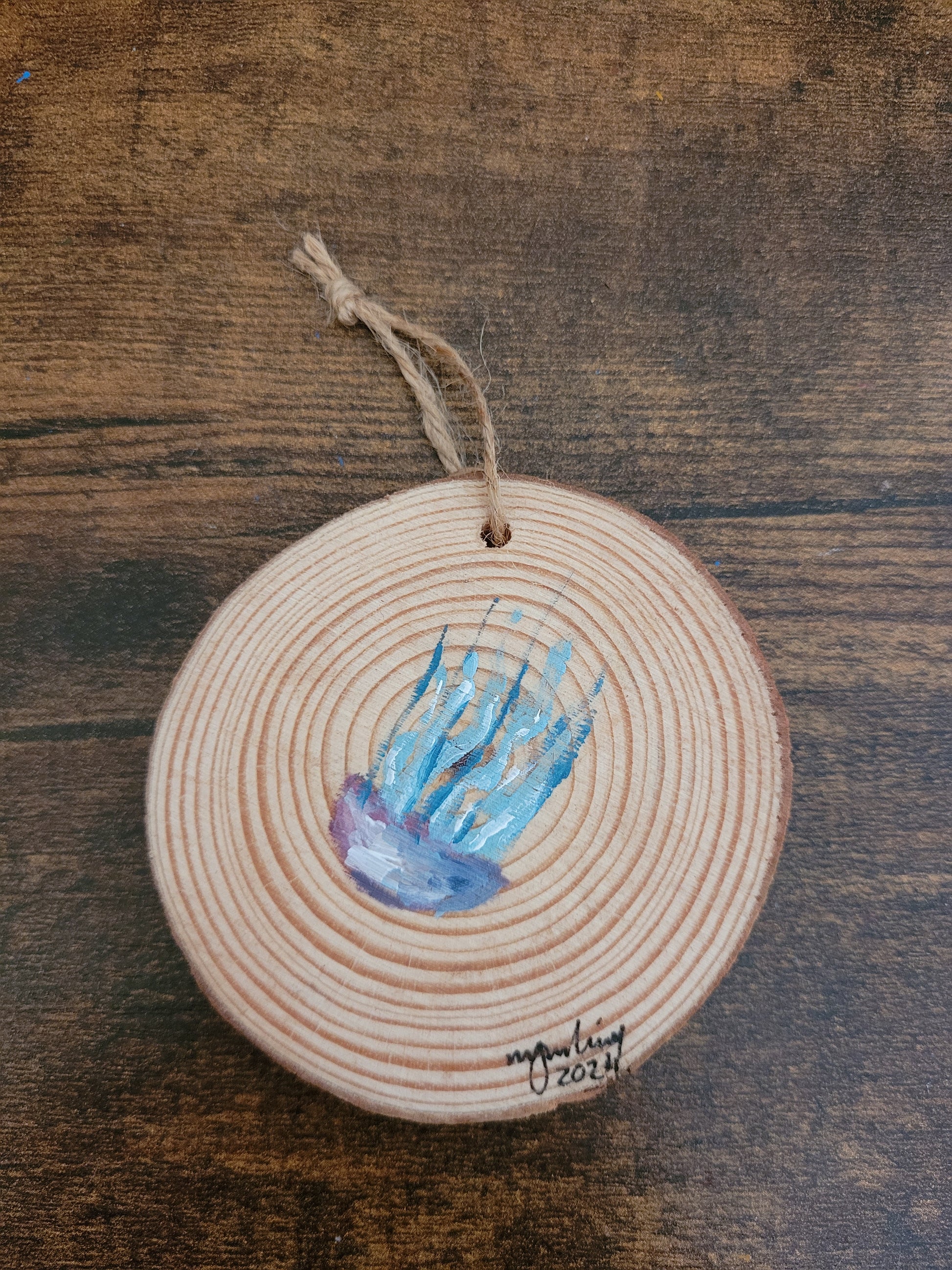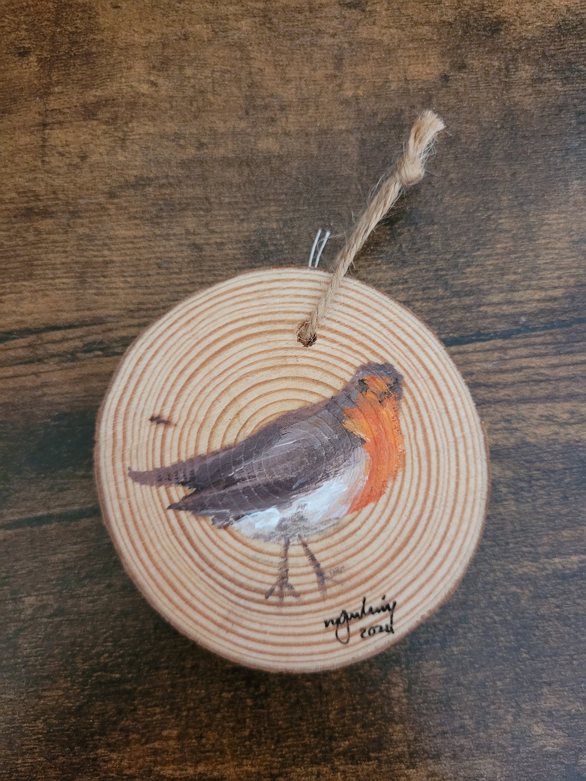 Each piece is painted with acrylics on a natural wooden slice, approximately 8–10 cm, with a drilled hole and string ready for hanging. Finished with a protective varnish to help your artwork last.