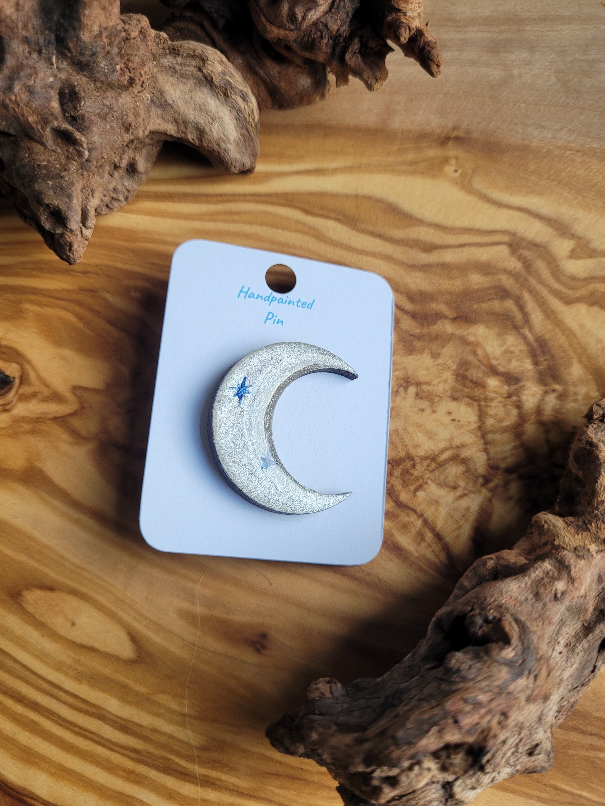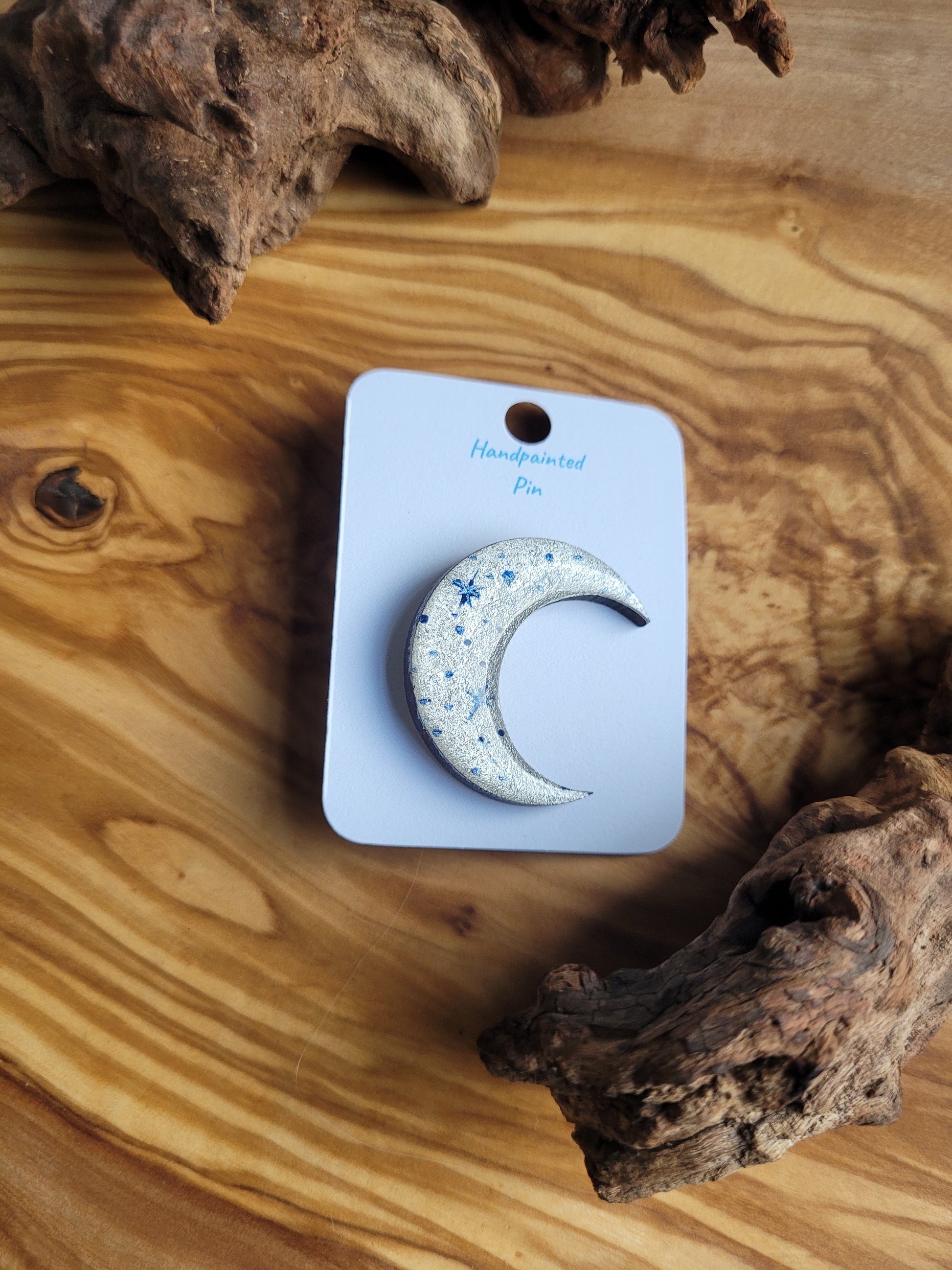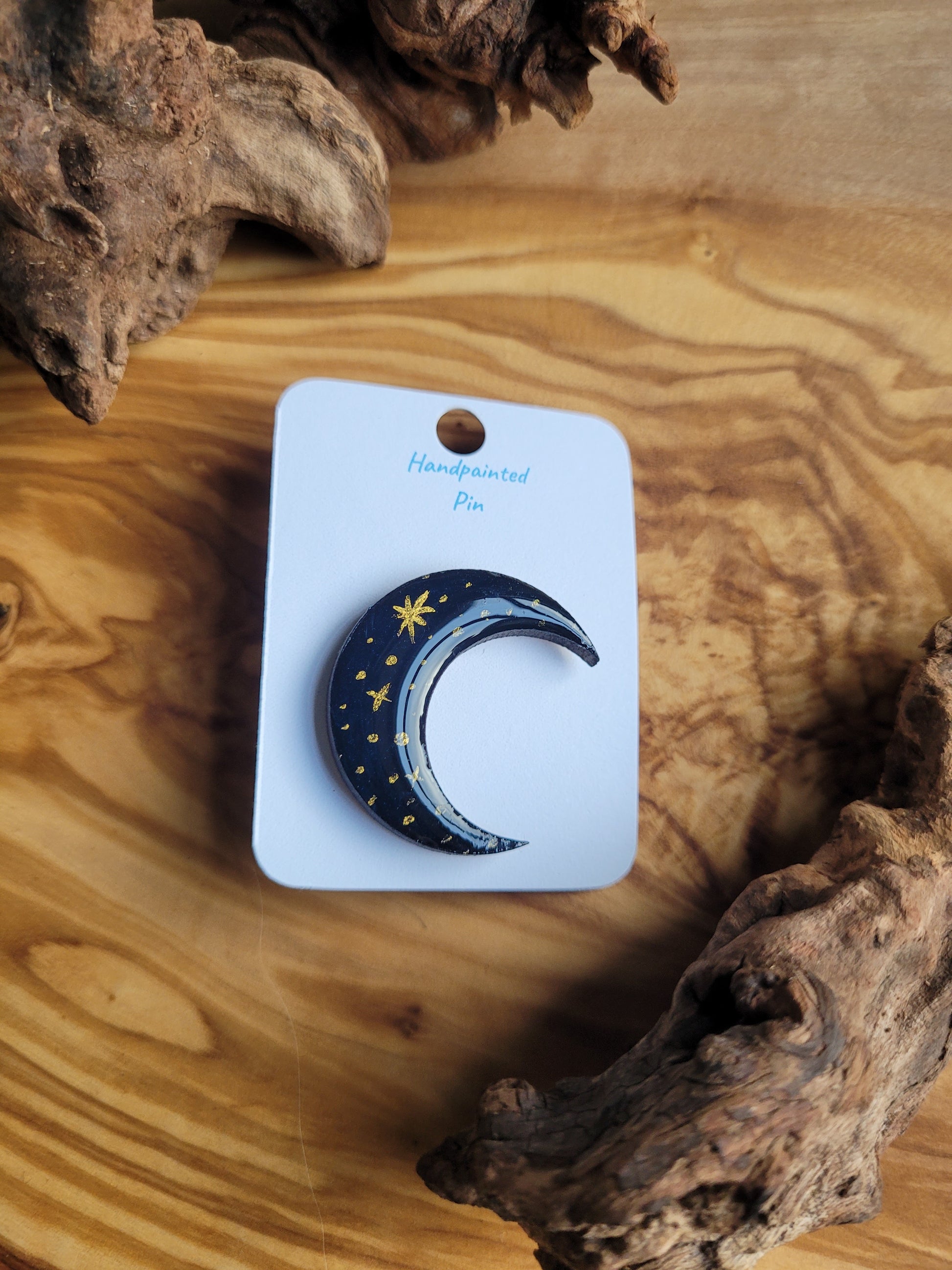 I paint each Moon pin by hand onto wood, then finish it with a glossy resin varnish to help it shine and stay protected for years to come. Each one is about 3 cm in size, just the right little companion for your jacket, bag, or pin board.
