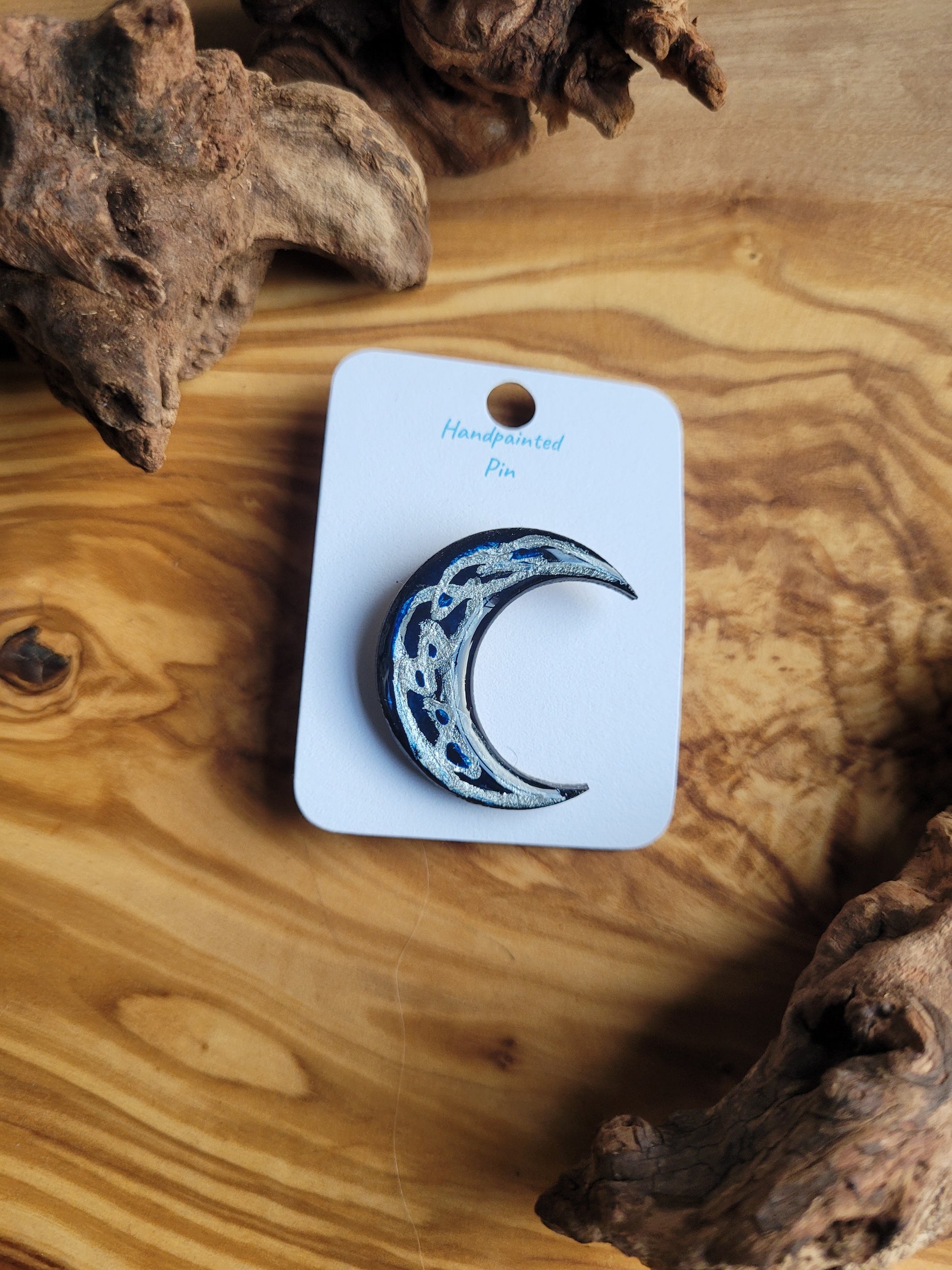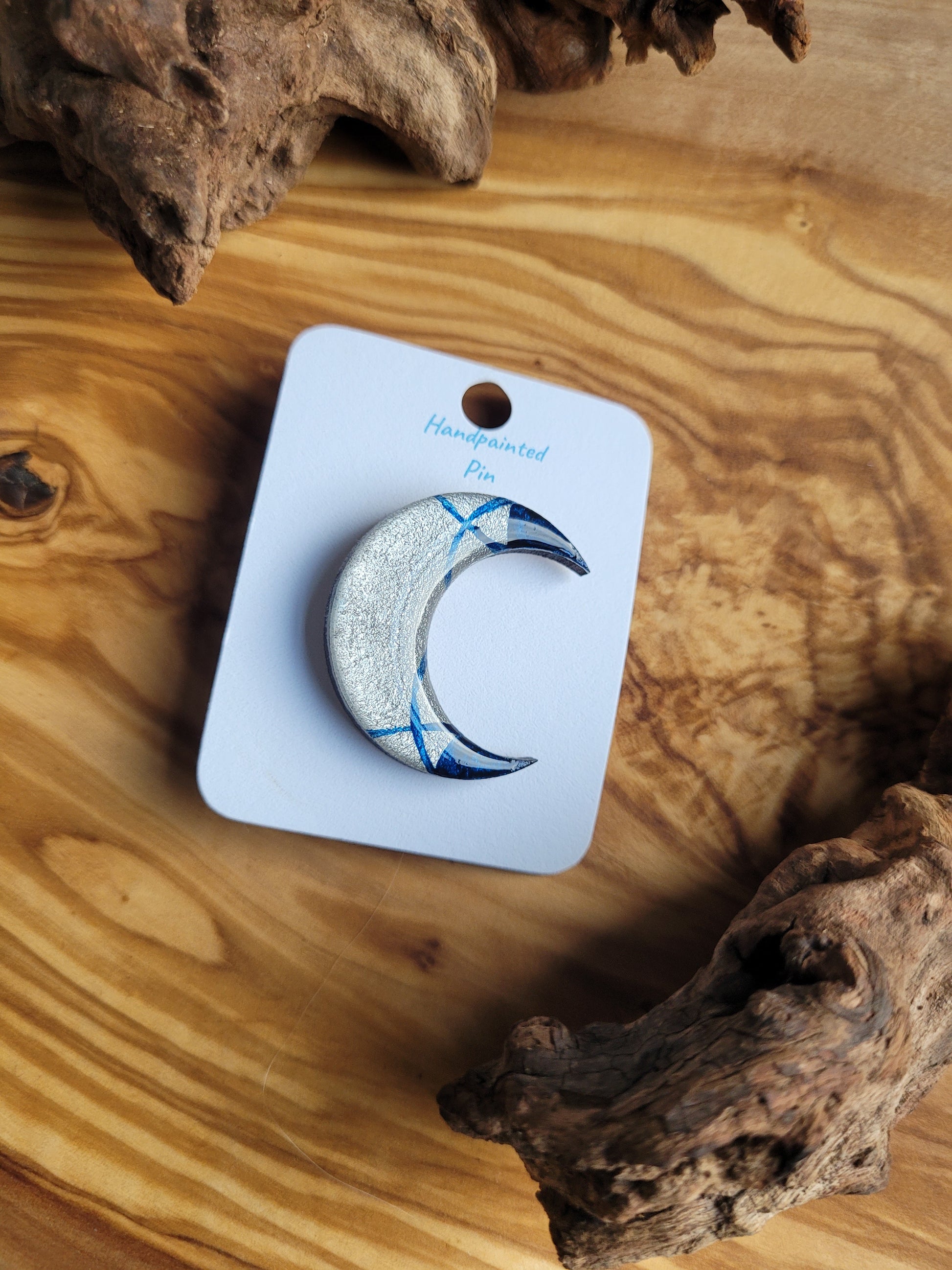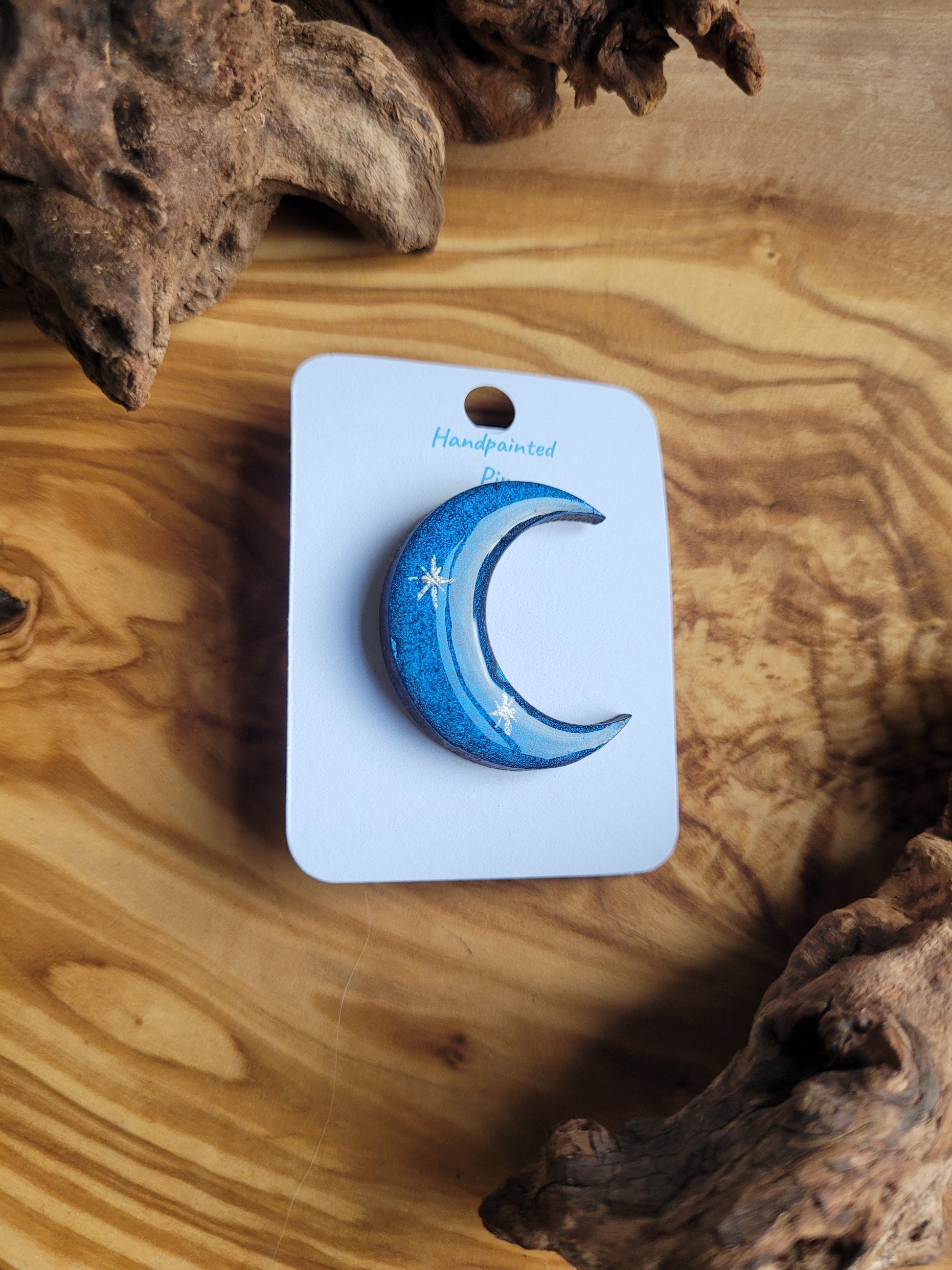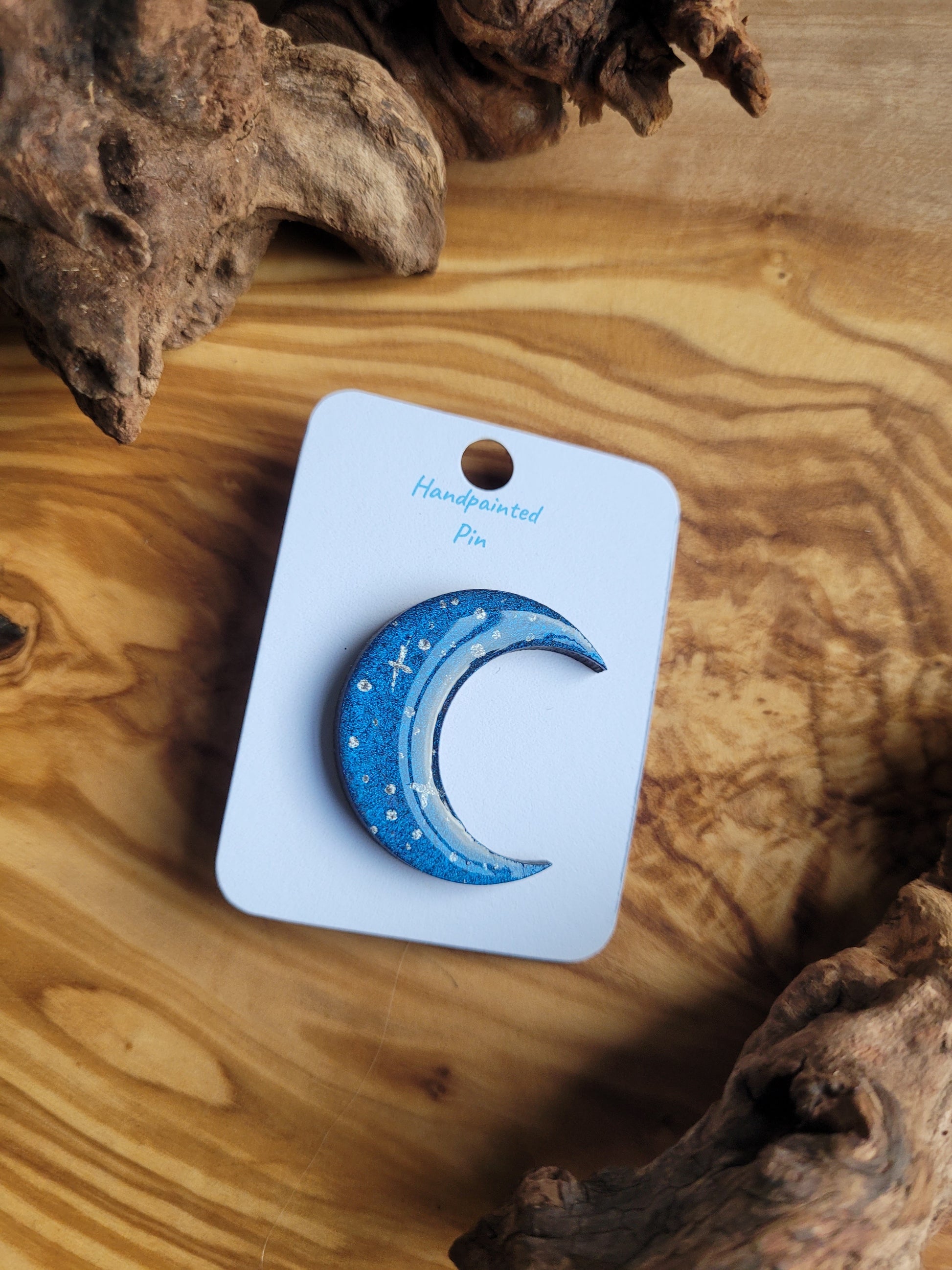 I paint each Moon pin by hand onto wood, then finish it with a glossy resin varnish to help it shine and stay protected for years to come. Each one is about 3 cm in size, just the right little companion for your jacket, bag, or pin board.
