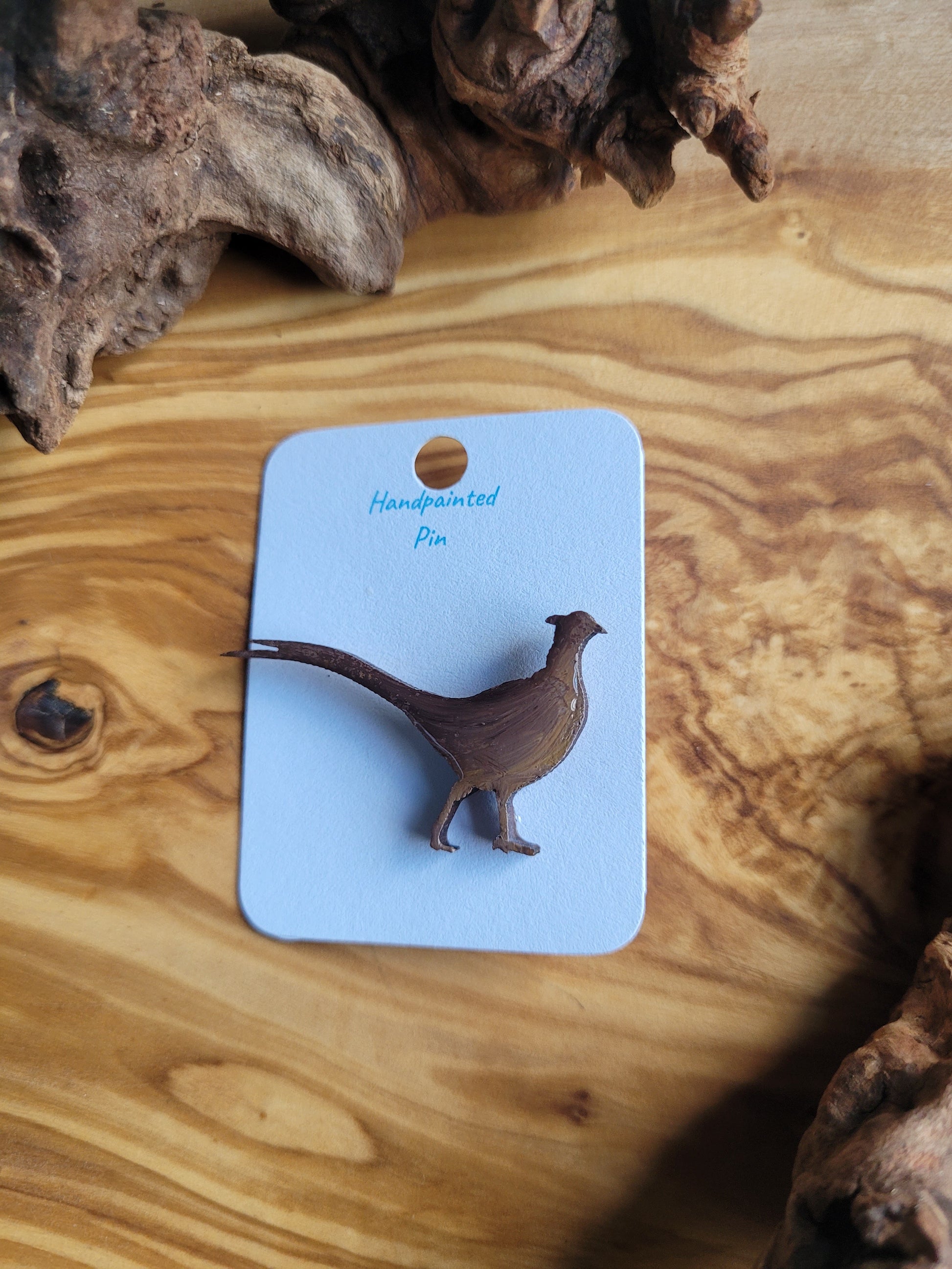 I paint each Pheasant pin by hand onto wood, then finish it with a glossy resin varnish to help it shine and stay protected for years to come. Each one is about 4 cm in size, just the right little companion for your jacket, bag, or pin board.
