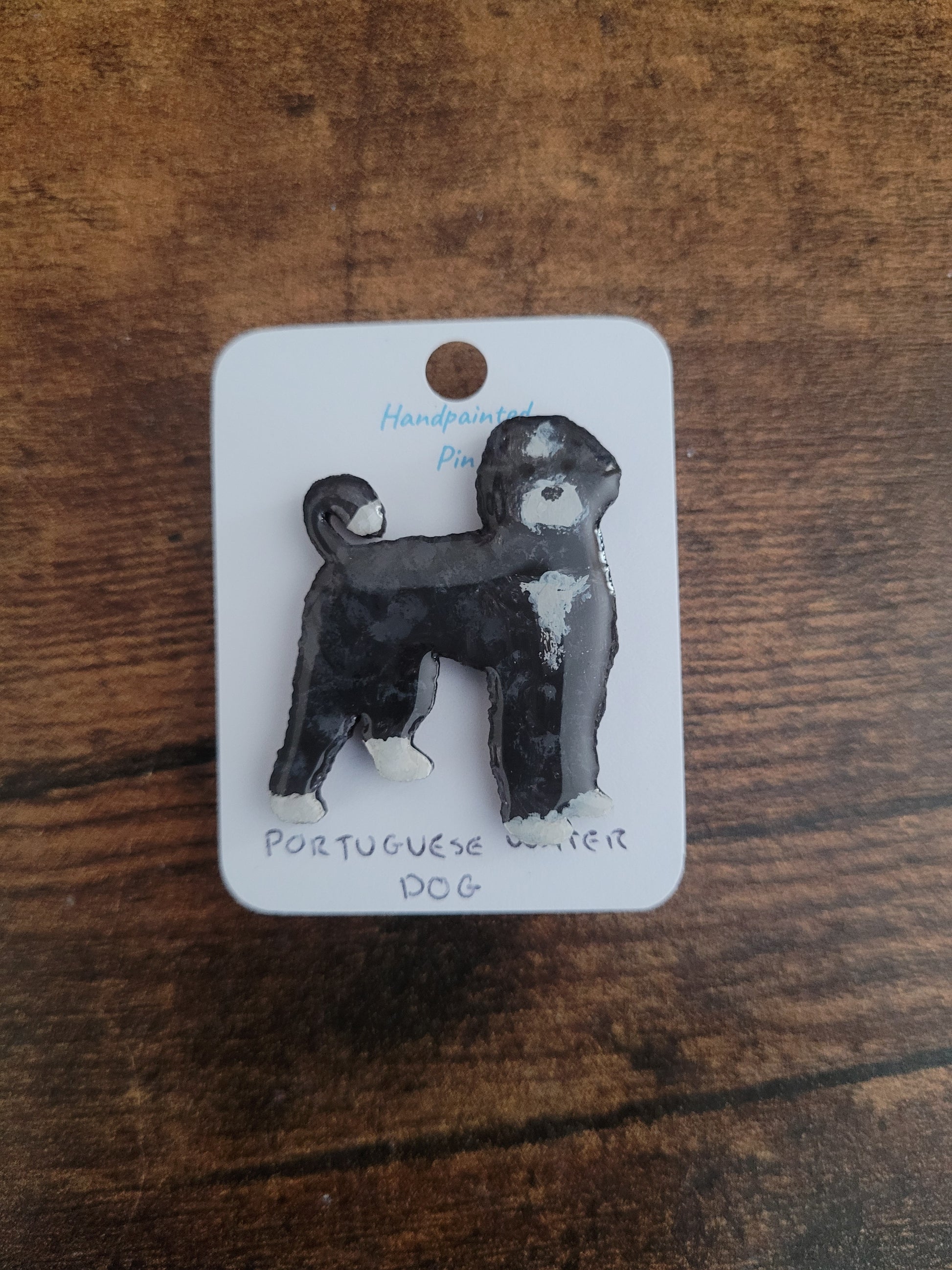 I paint each Portuguese Water Dog pin by hand onto wood, then finish it with a glossy resin varnish to help it shine and stay protected for years to come. Each one is about 4 cm in size, just the right little companion for your jacket, bag, or pin board.