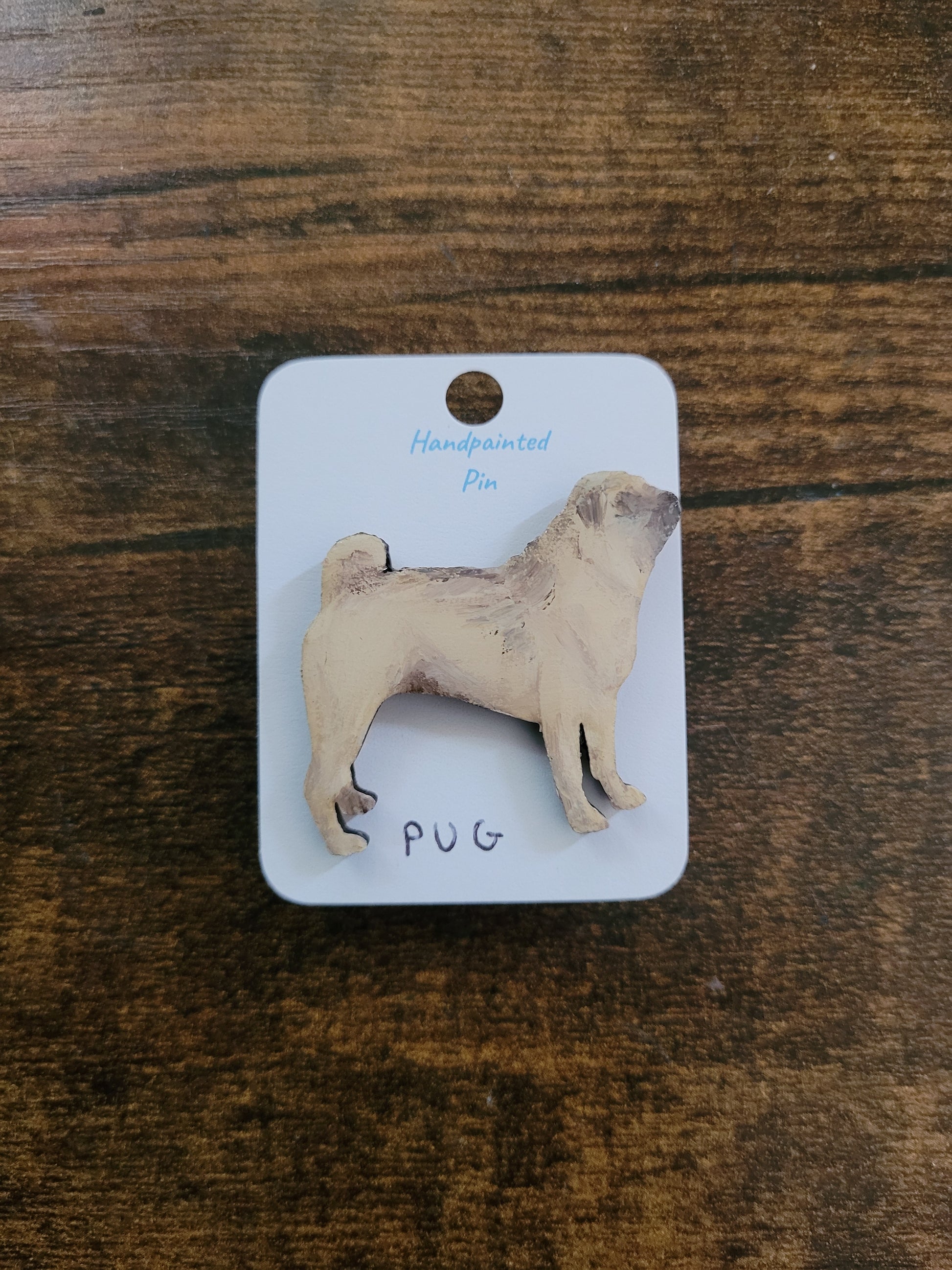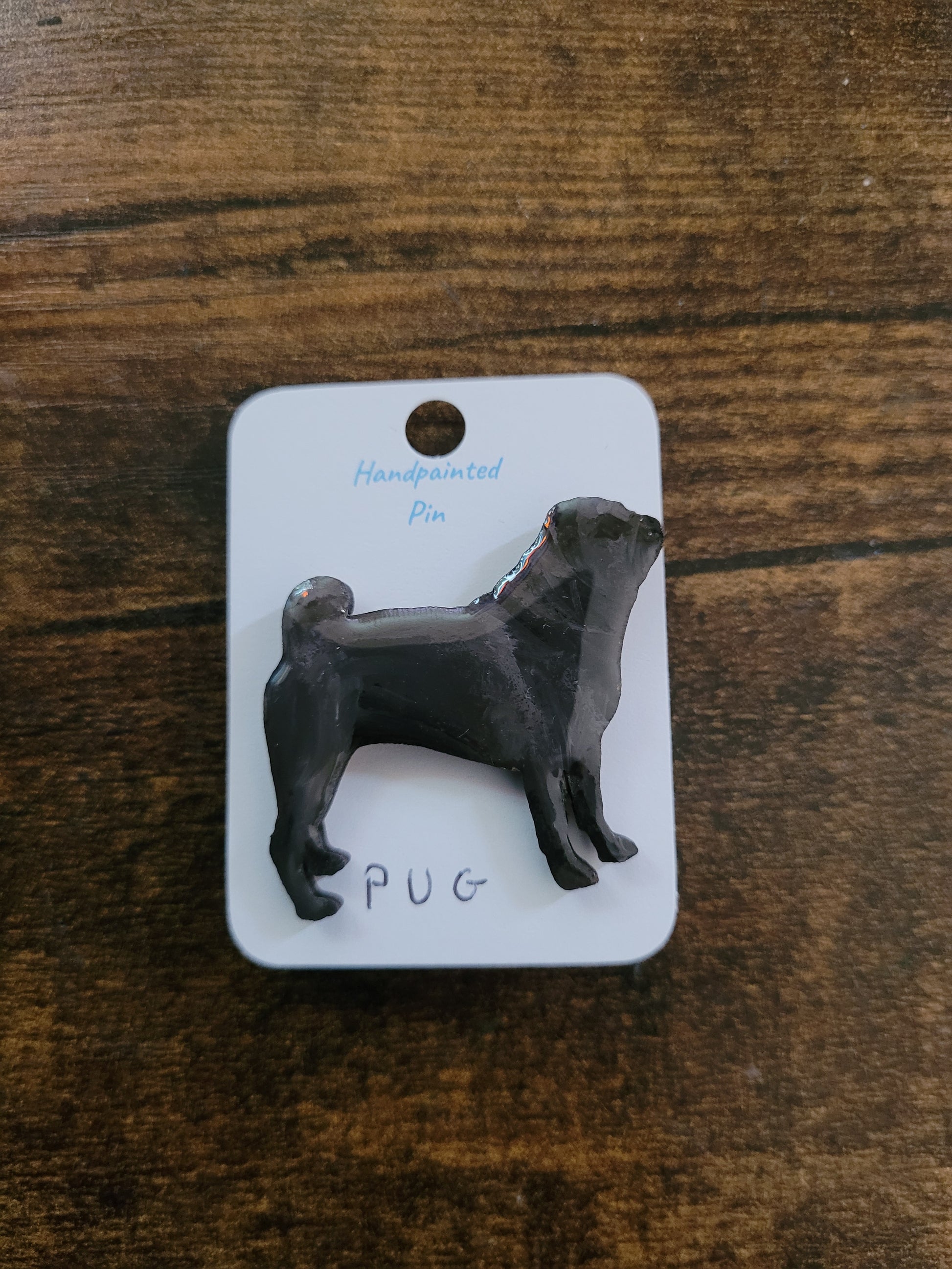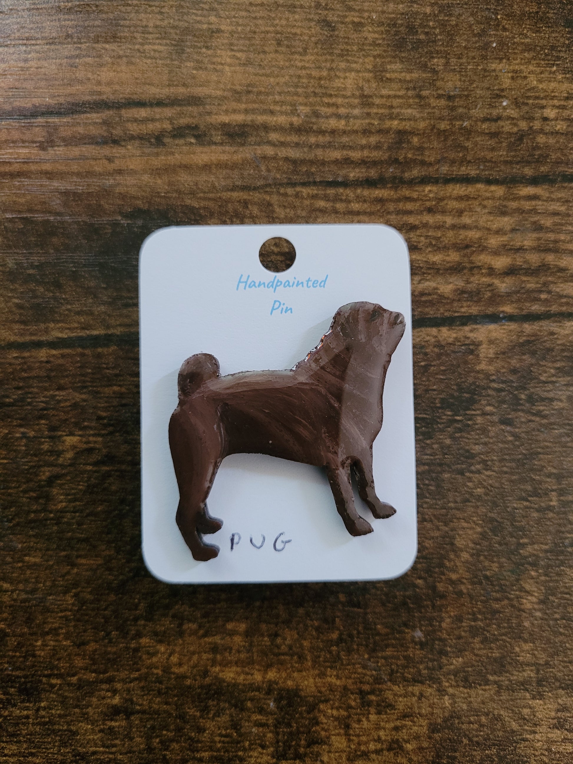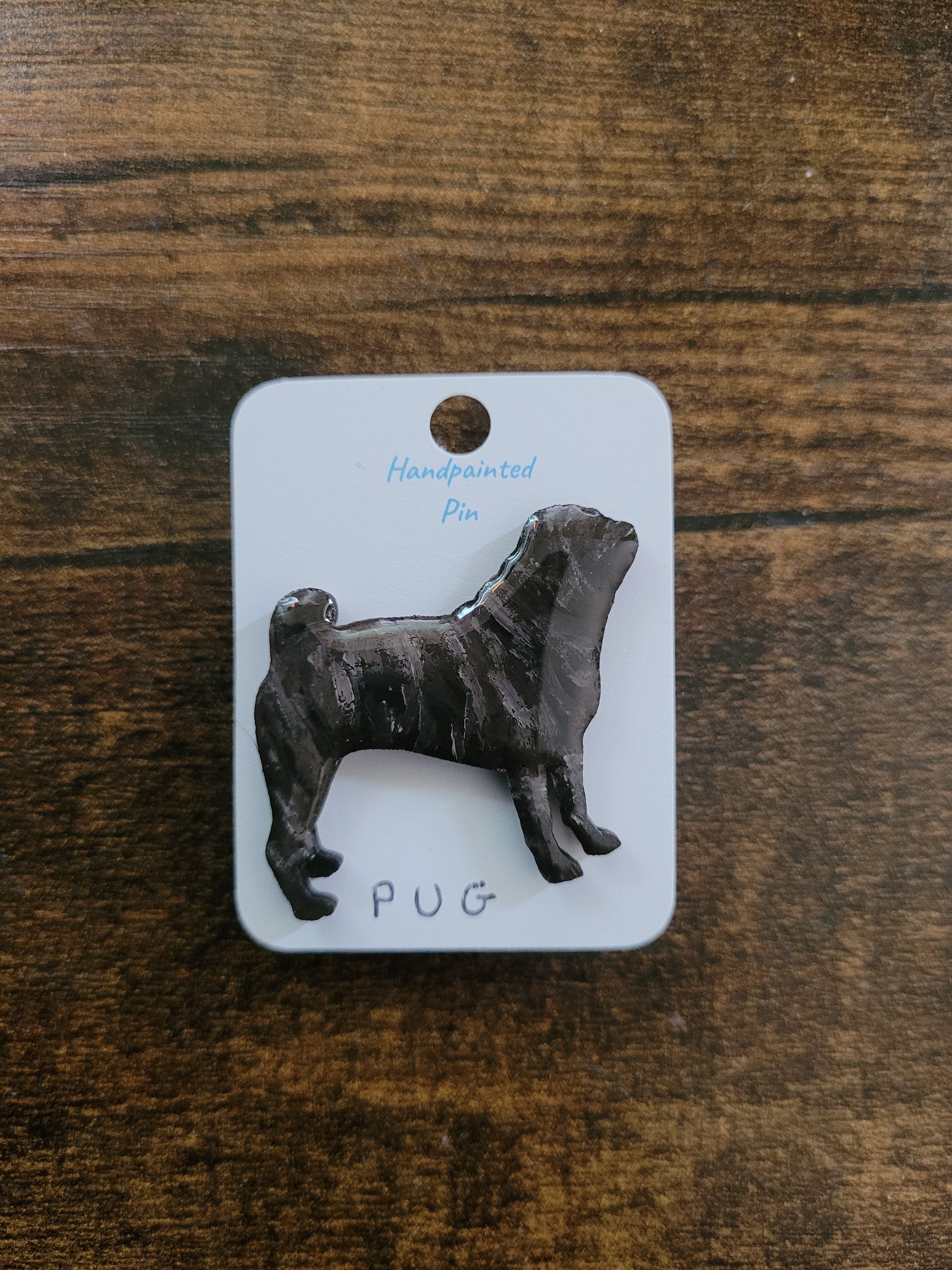 I paint each Pug pin by hand onto wood, then finish it with a glossy resin varnish to help it shine and stay protected for years to come. Each one is about 4 cm in size, just the right little companion for your jacket, bag, or pin board.