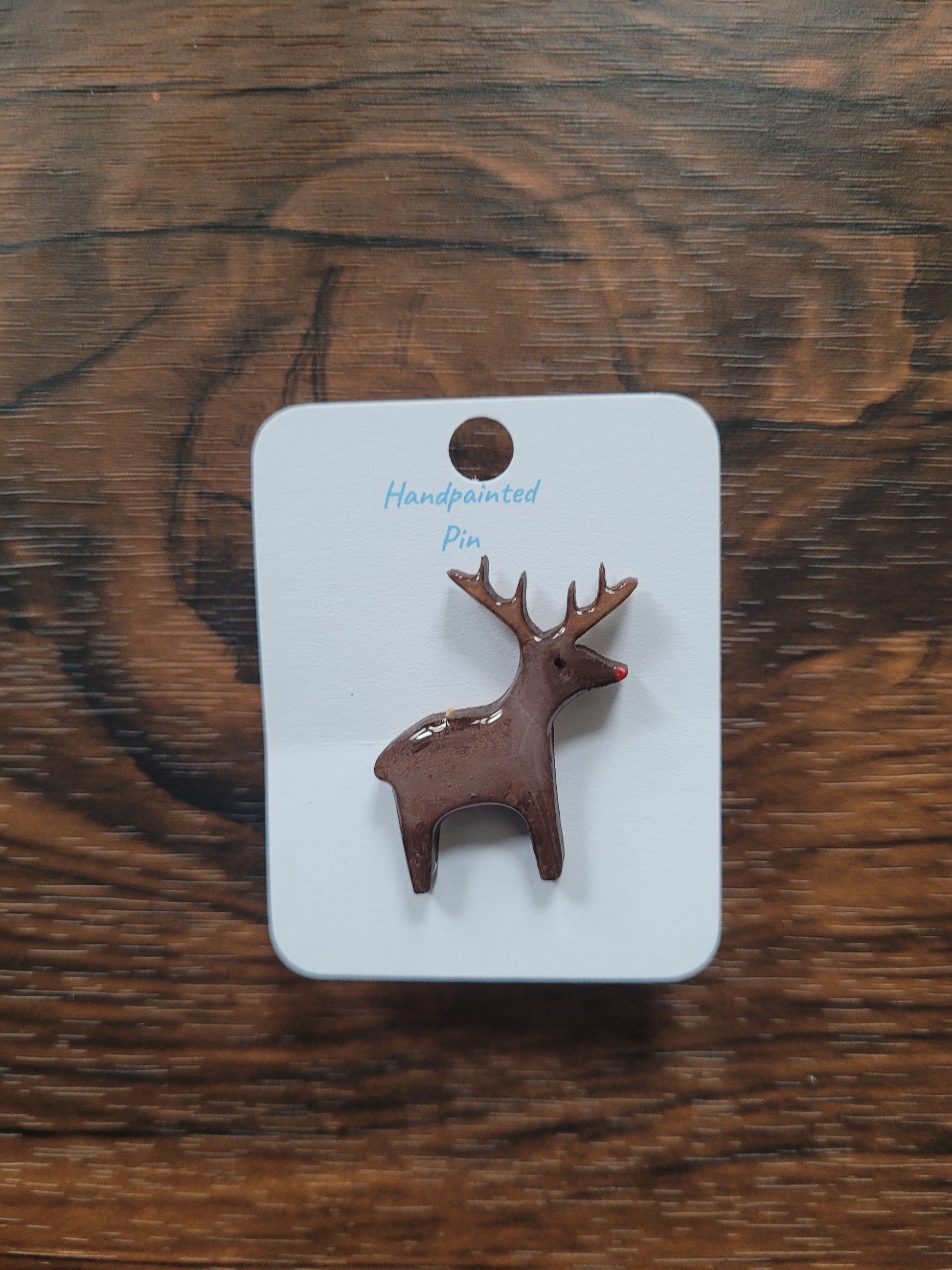 I paint each Reindeer pin by hand onto wood, then finish it with a glossy resin varnish to help it shine and stay protected for years to come. Each one is about 4 cm in size, just the right little companion for your jacket, bag, or pin board.