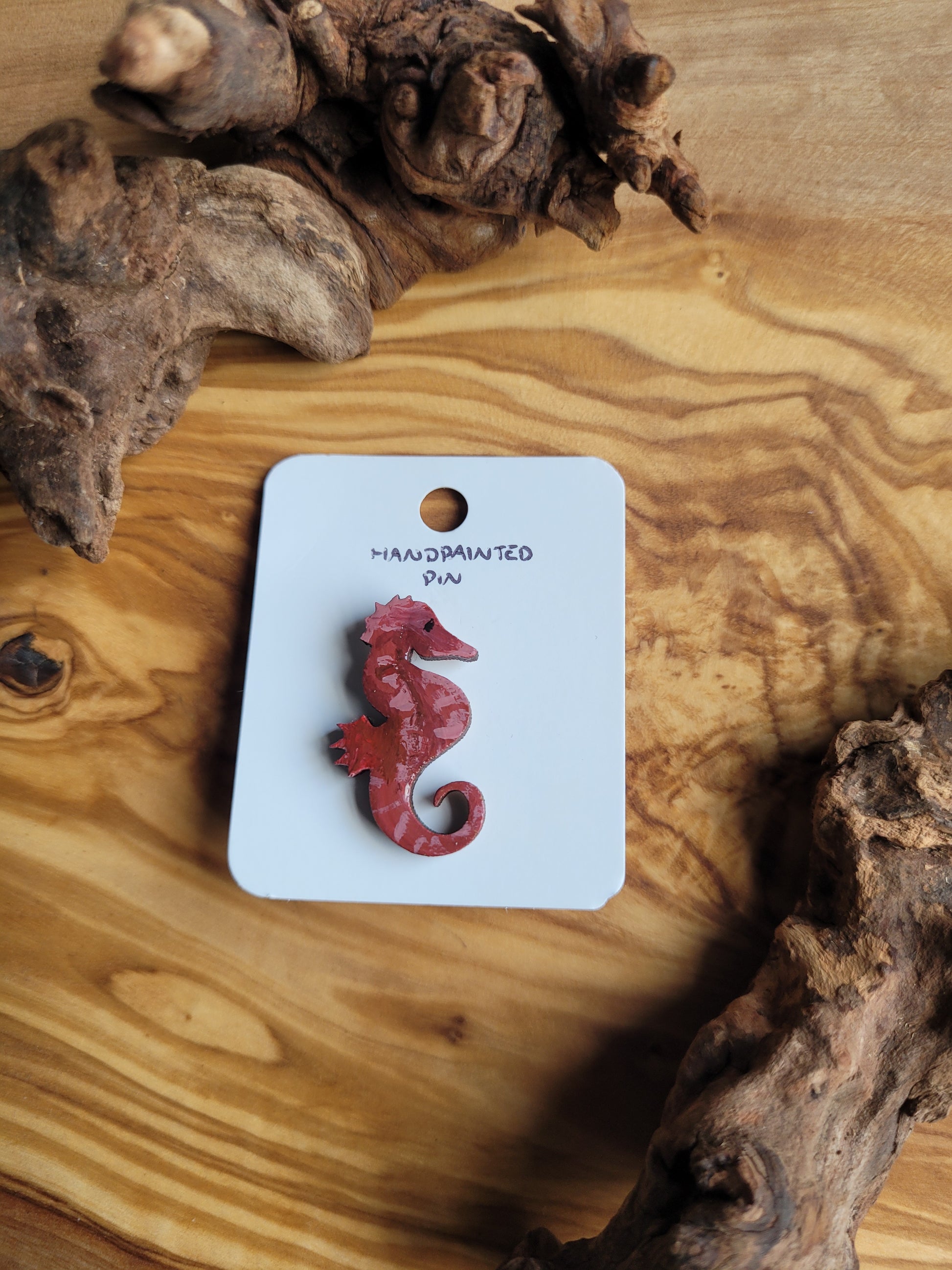 I paint each Seahorse pin by hand onto wood, then finish it with a glossy resin varnish to help it shine and stay protected for years to come. Each one is about 3 cm in size, just the right little companion for your jacket, bag, or pin board.
