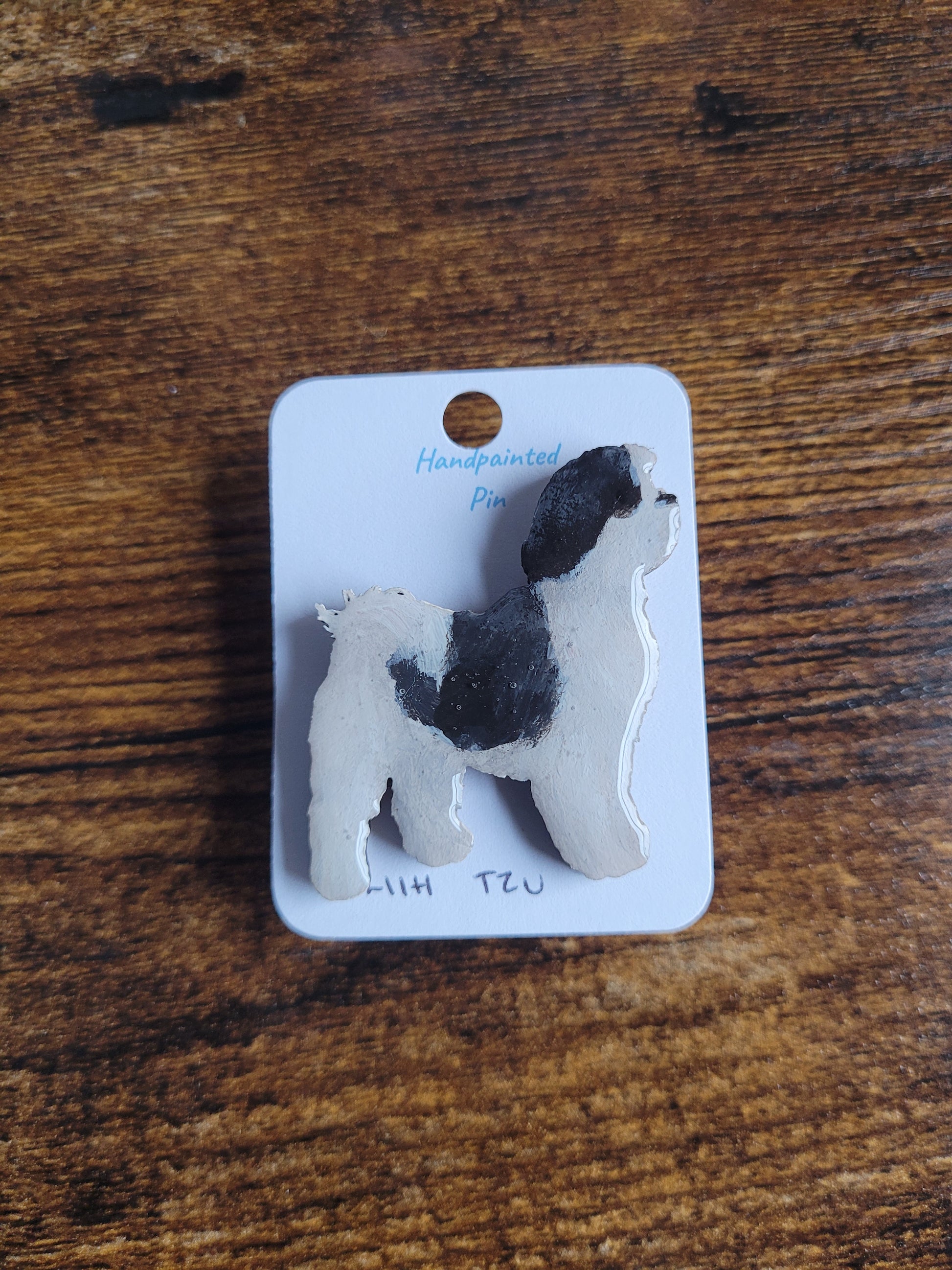 I paint each Shih Tzu pin by hand onto wood, then finish it with a glossy resin varnish to help it shine and stay protected for years to come. Each one is about 4 cm in size, just the right little companion for your jacket, bag, or pin board.