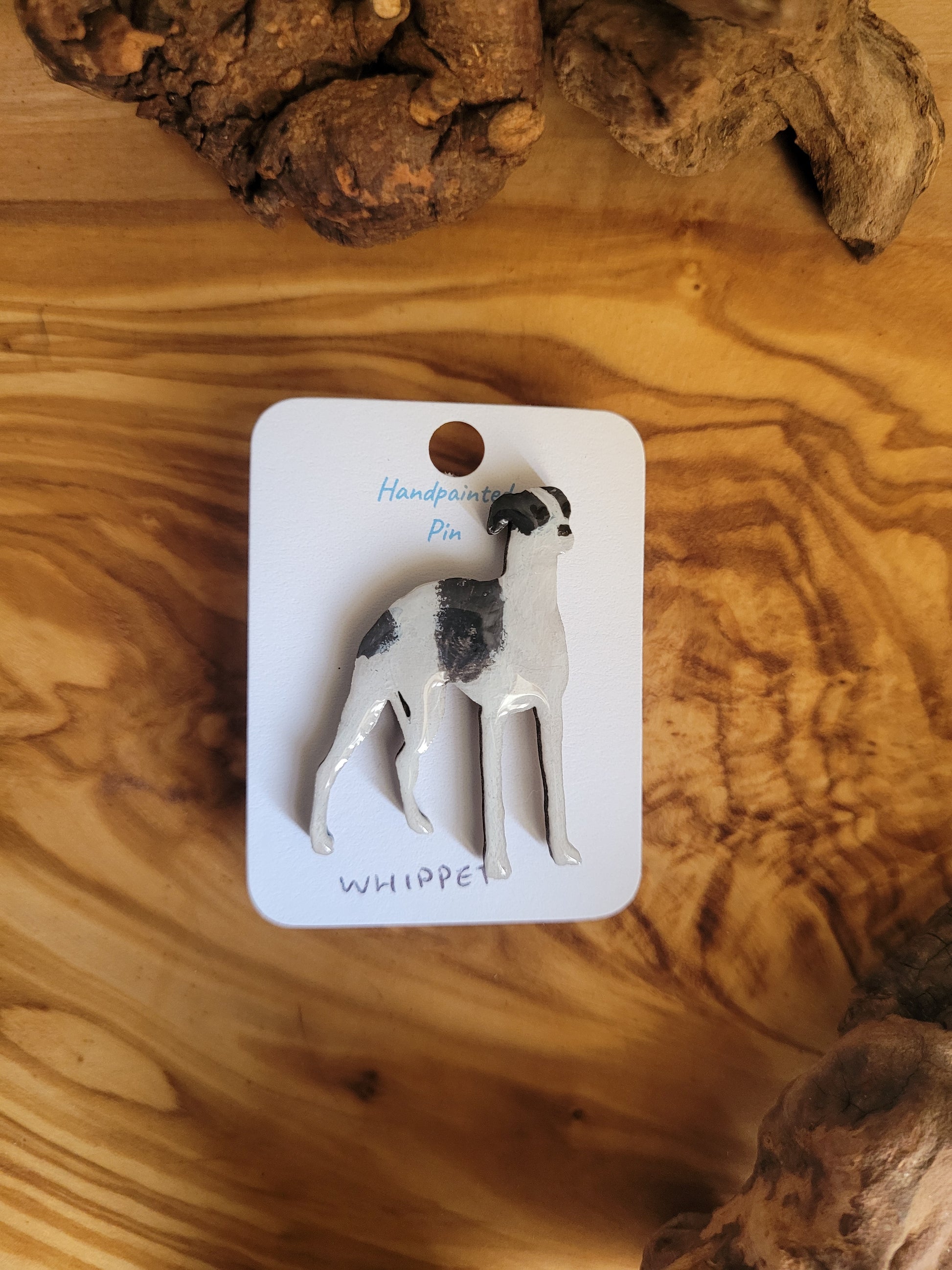 I paint each Whippet pin by hand onto wood, then finish it with a glossy resin varnish to help it shine and stay protected for years to come. Each one is about 4 cm in size, just the right little companion for your jacket, bag, or pin board.